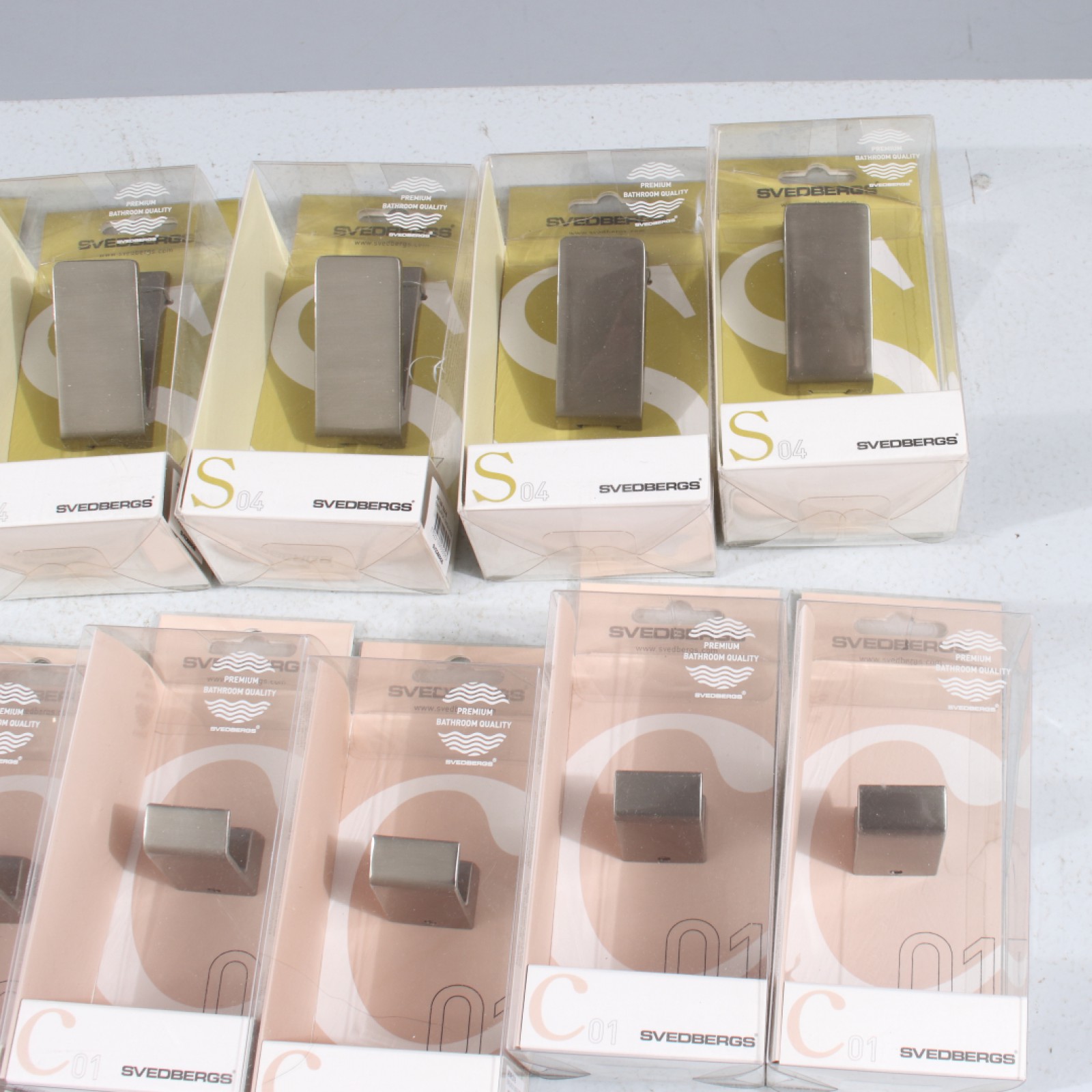 SVEDBERGS "BADRUMSKROKAR" 13 stycken, rostfritt, oanvända i originalförpackningar, 5st modell C01 samt 8st modell S04 (1+1 stycken utan förpackningar medföljer). (vån3) Avslutas 2025-10-05 18:05:00