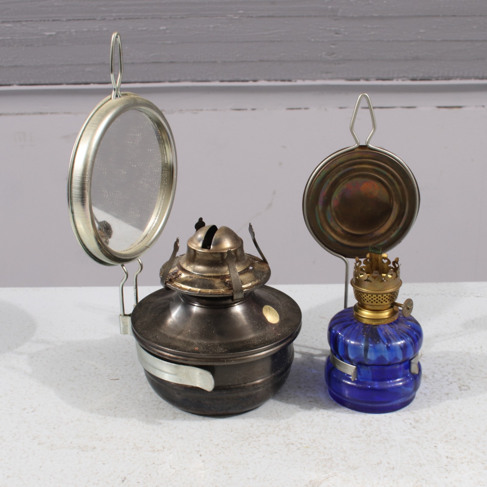 VÄGGFOTOGENLAMPOR 2 stycken, båda saknar brännarrör, höjd 20-24 cm. (vån3) Avslutas 2025-11-02 18:03:00
