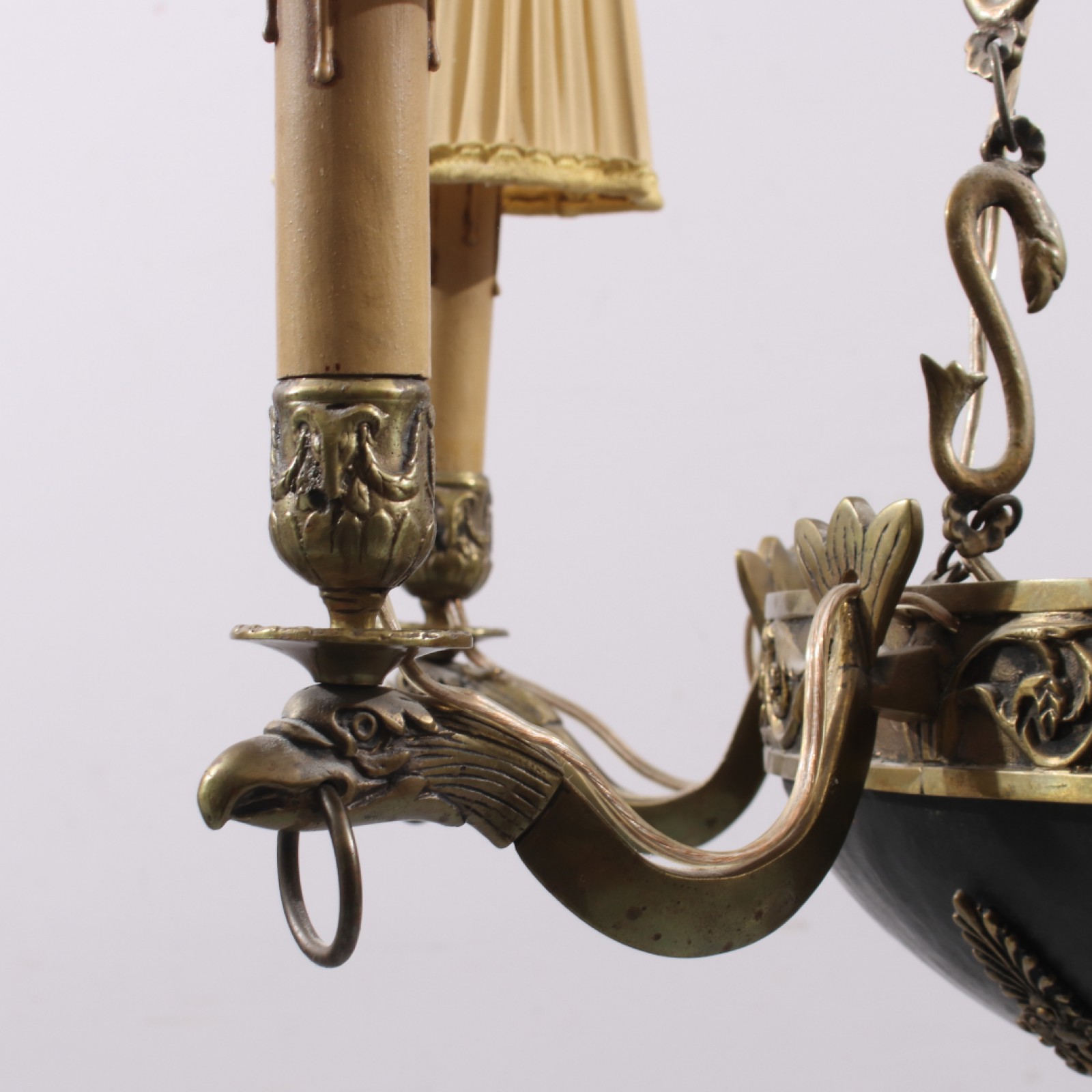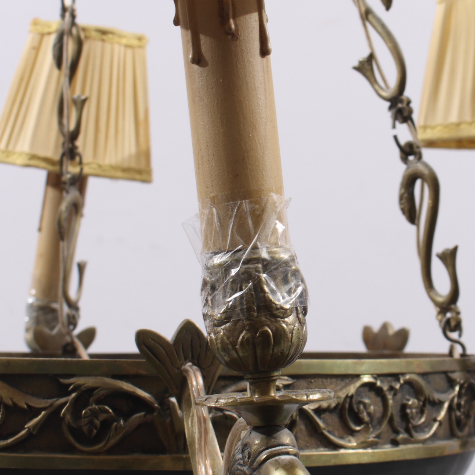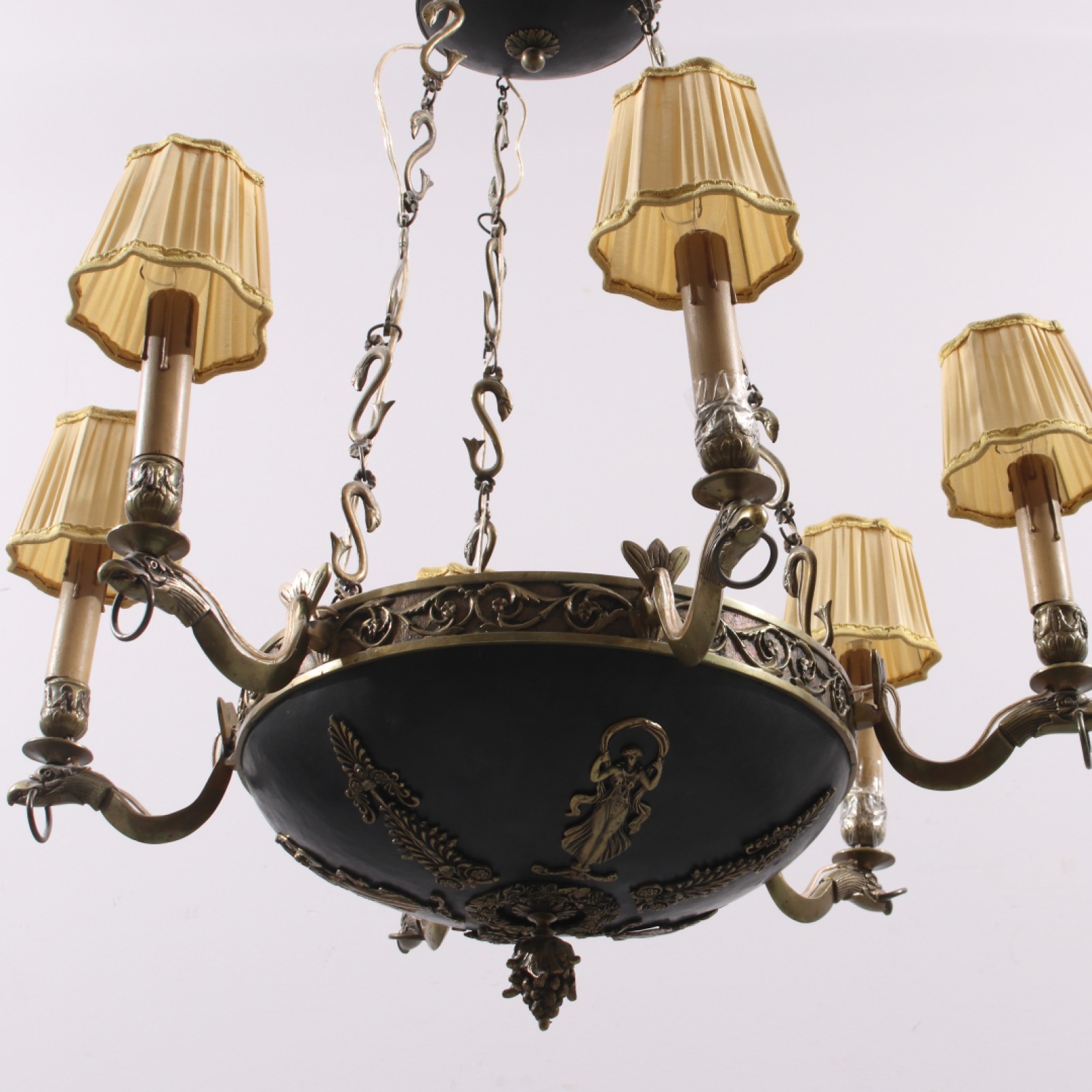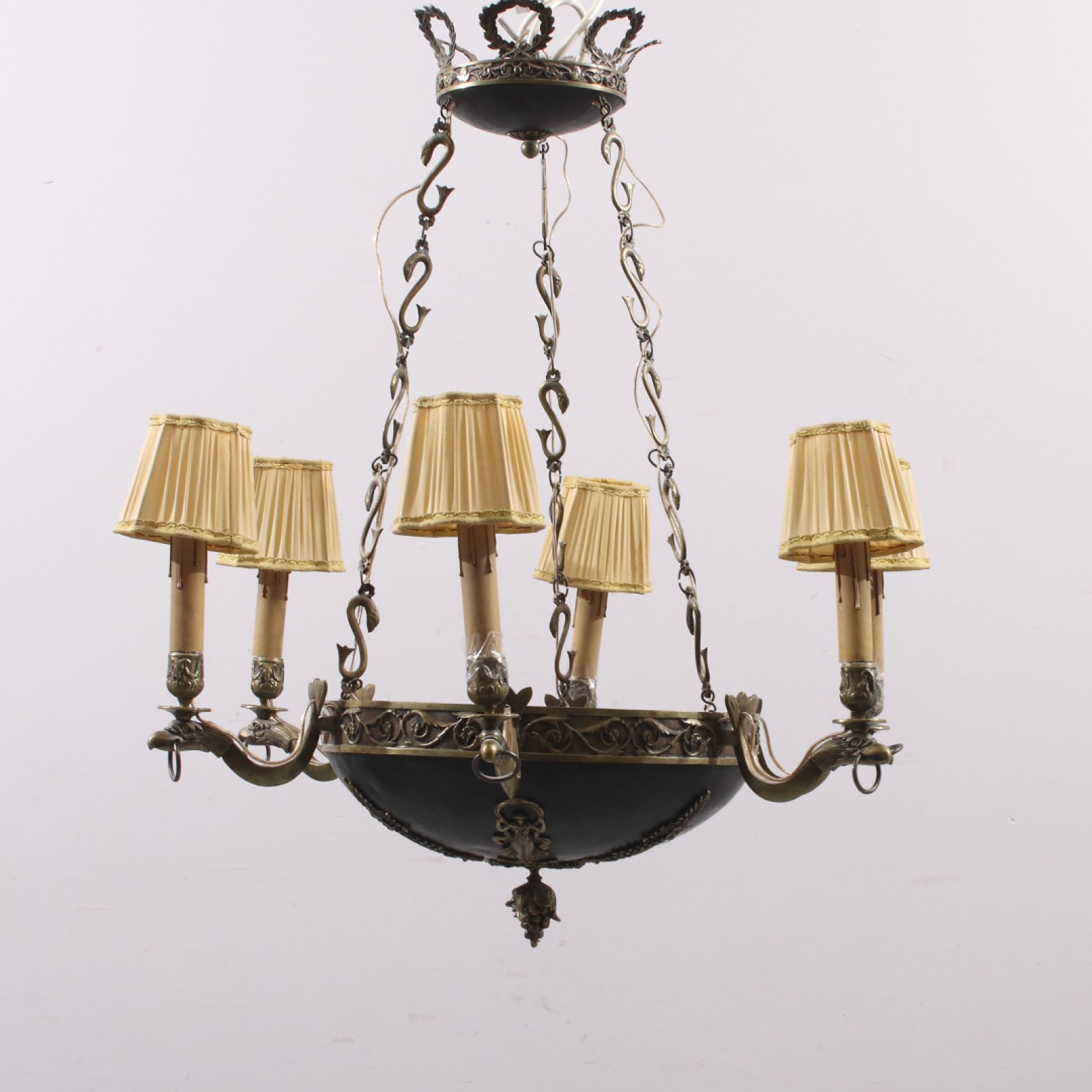TAKLAMPA EMPIRESTIL 1930,40-tal, 6-armad, 3st ljuspipor sitter fast med tejp, tygklädda skärmar medföljer, höjd 70 cm, bredd 65 cm. (vån1) Avslutas 2025-11-02 18:06:00
