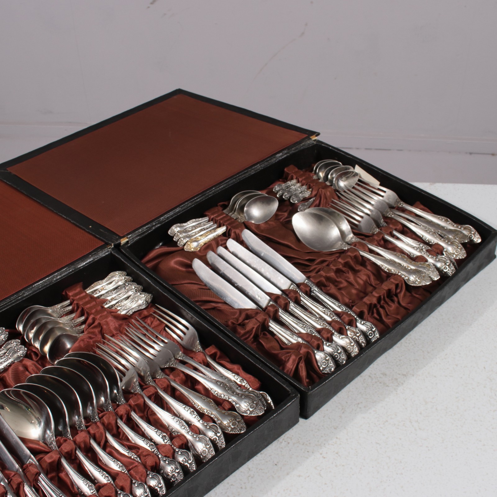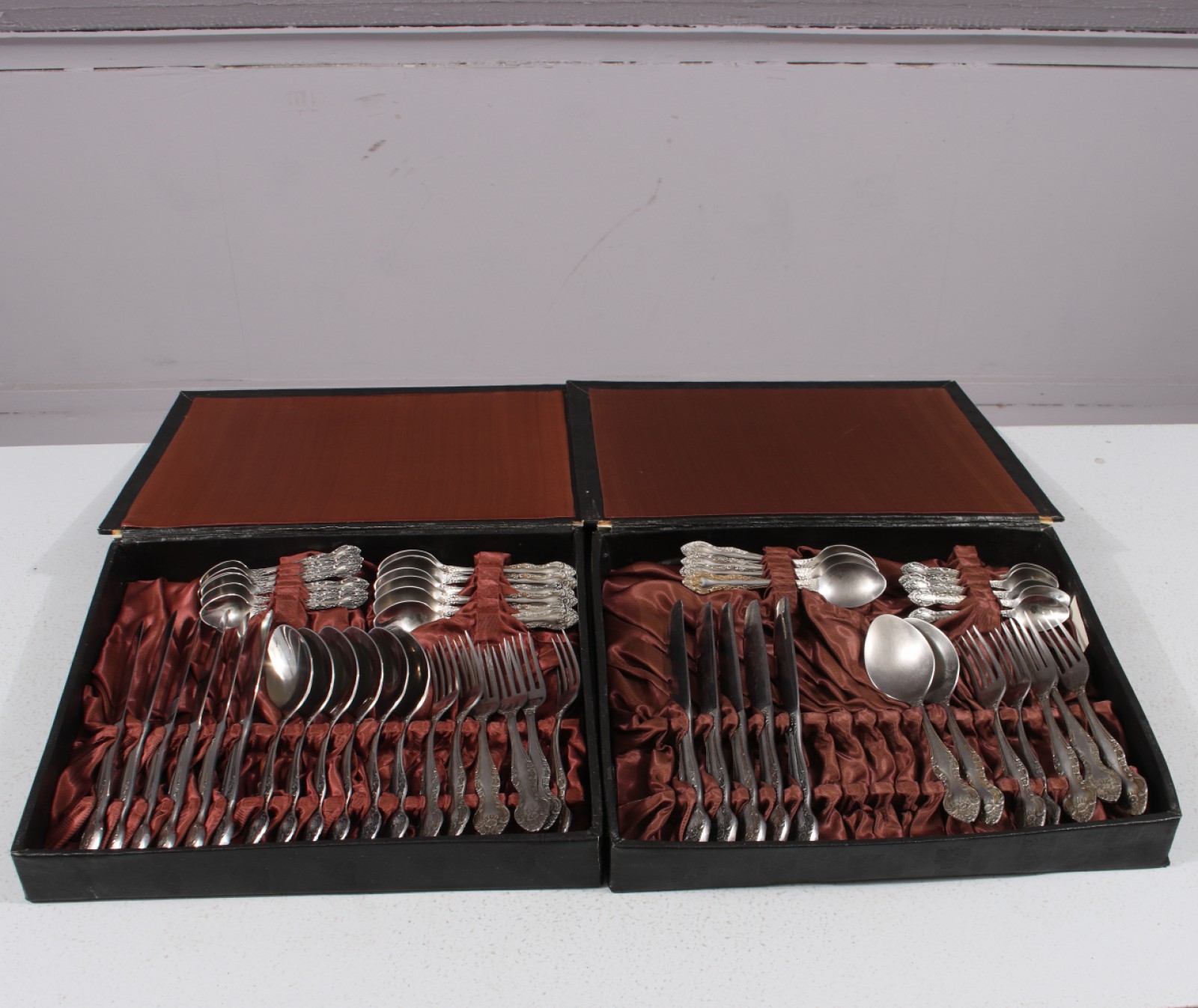11 st matknivar, 11st matgafflar, 8st matskedar , 10st teskedar samt 10st kaffeskedar, originalschatull medföljer.