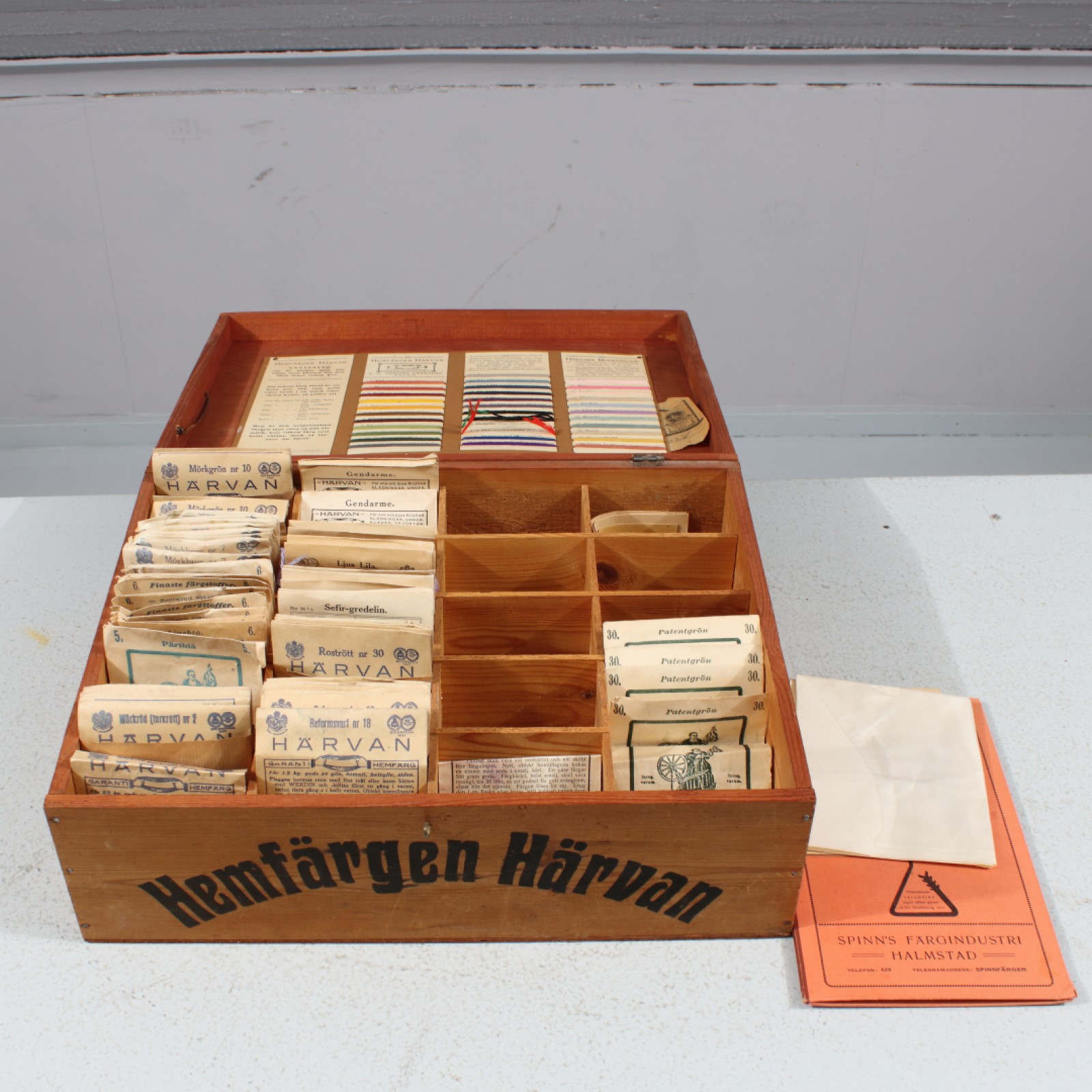LÅDA MED "HEMFÄRGEN HÄRVAN" HEMMAFÄRGNING AV GARNER 1900-talets mitt, för innehåll se bilder, låda 14x39,5x30,5 cm. (vån3) Avslutas 2025-12-07 18:14:00
