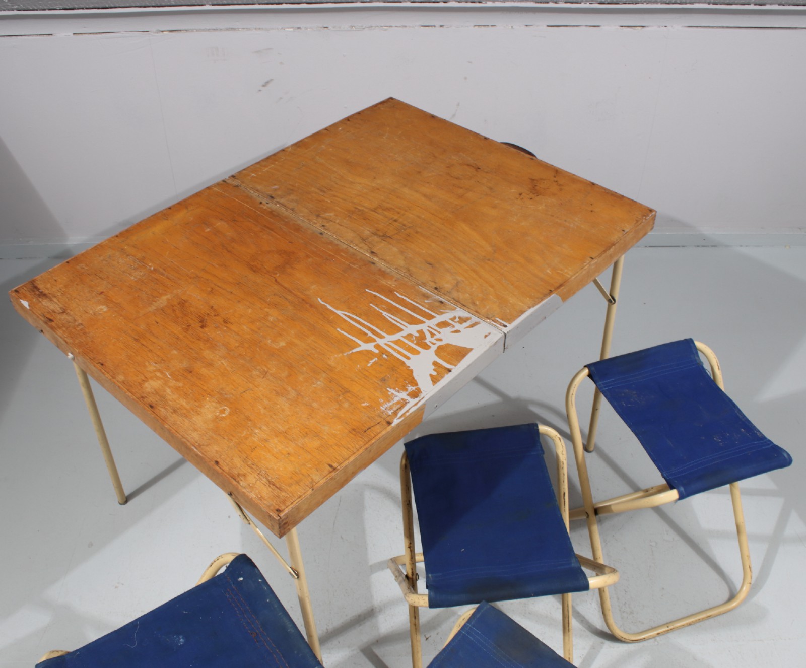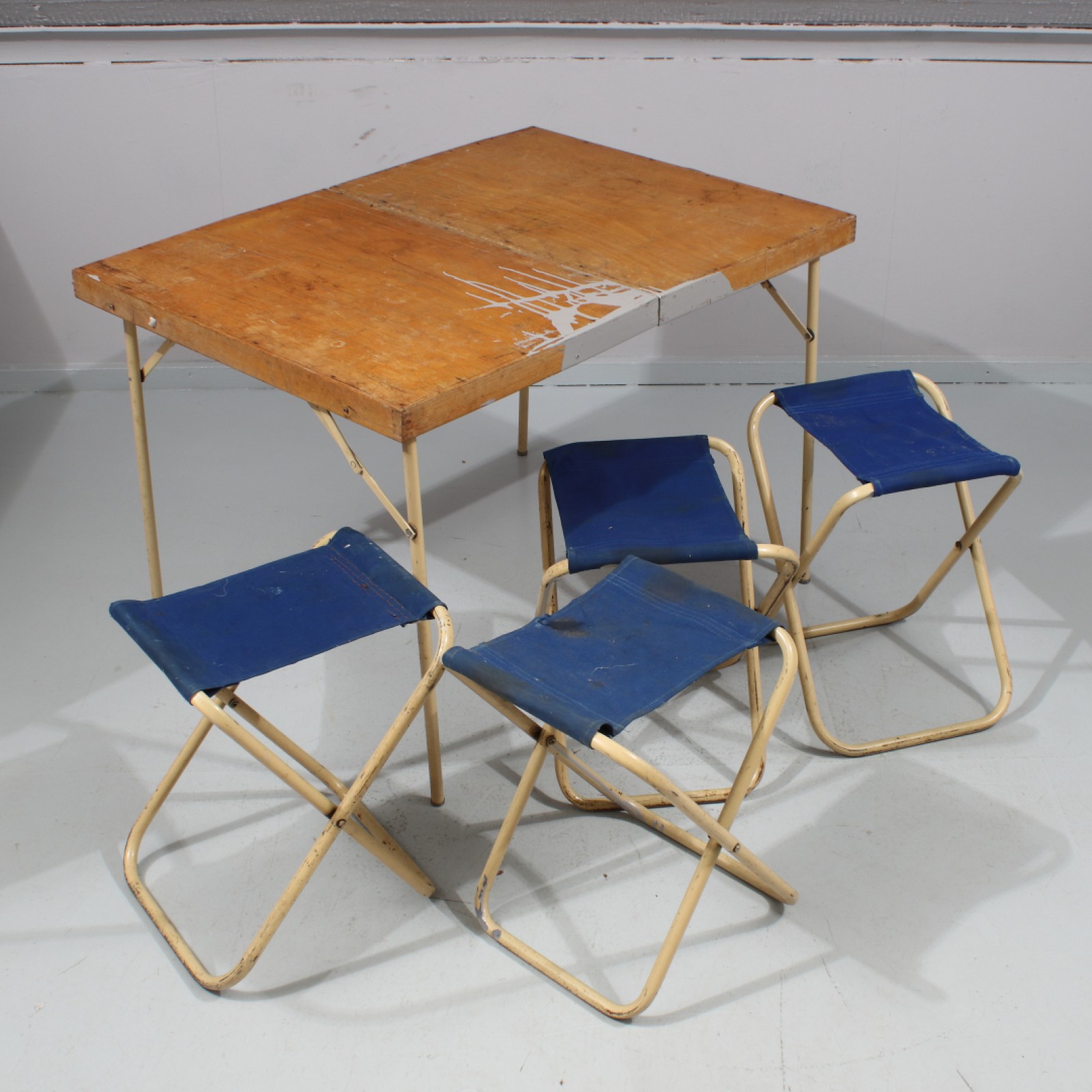 4st pallar samt 1st bord, 1950,60-tal, hopfällbart, slitage, målarfläckar. (vån2)