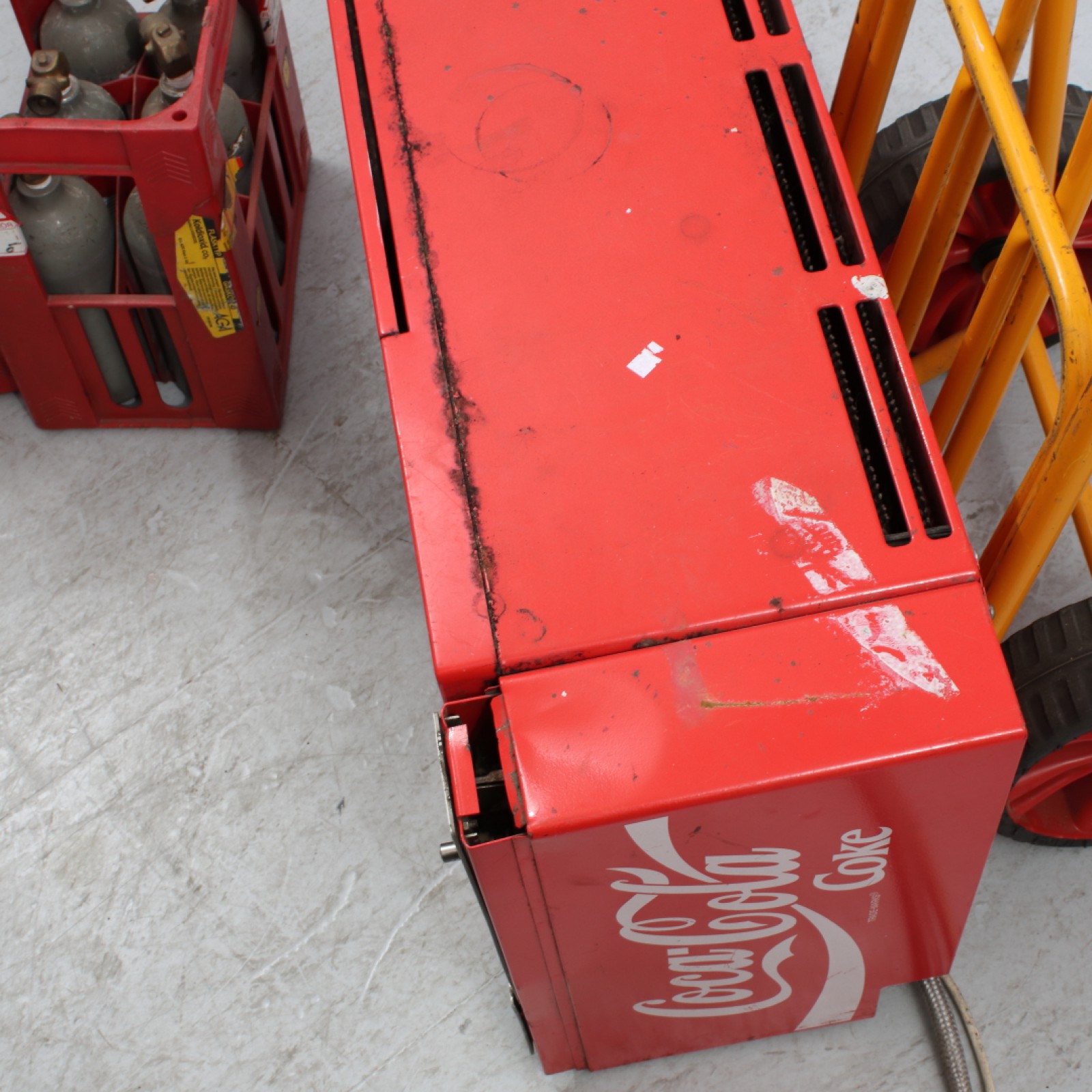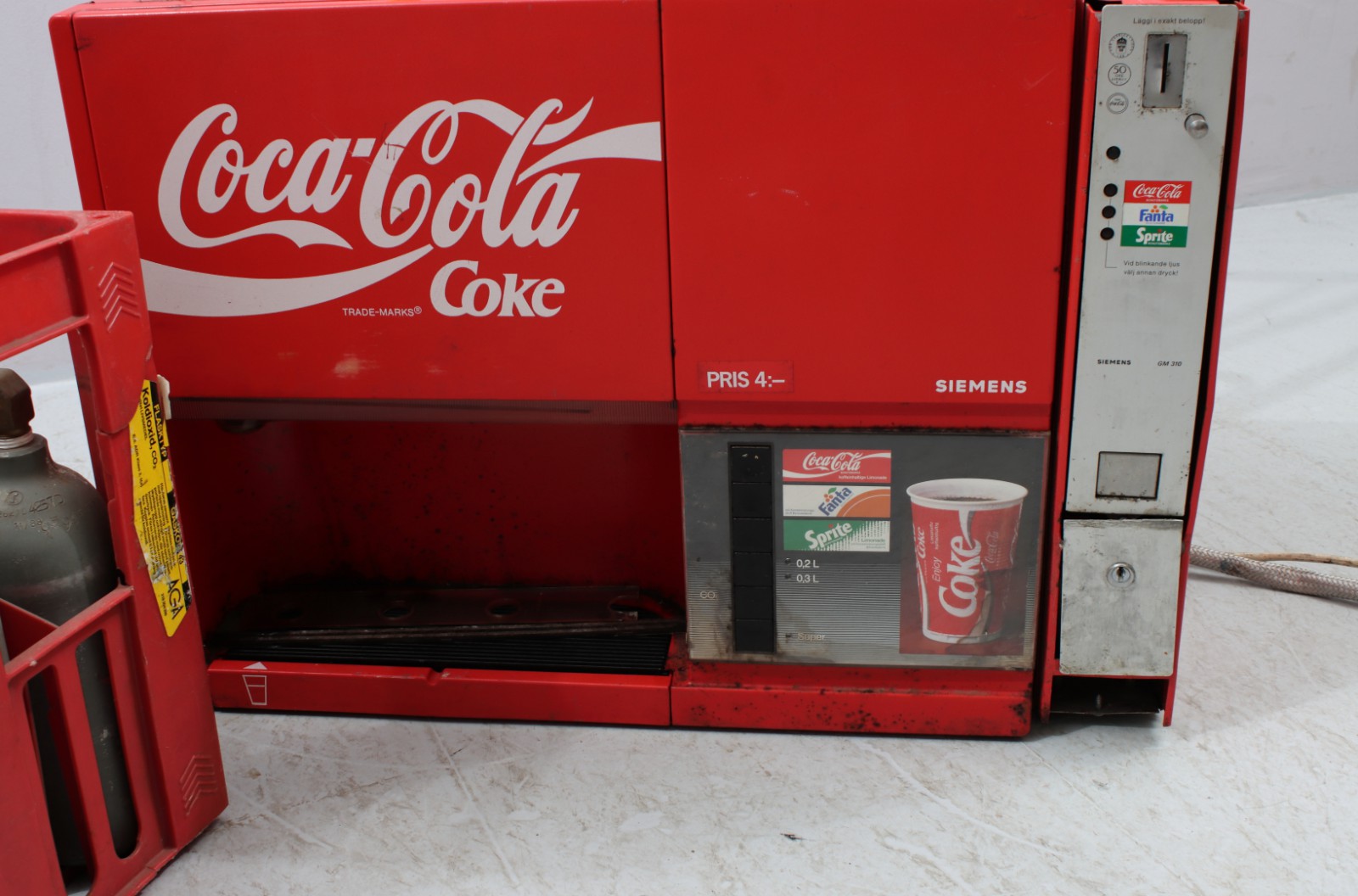 LÄSKEDRYCKSMASKIN "COCA-COLA" 1900-talets senare del, 12st tomma kolsyreflaskor medföljer, myntfack upplåst men nyckel saknas, slitage, någon buckla, 1st plåt över myntfack saknas, ej testad ingen garanti lämnas, H.45,5, B.64, Dj.28 cm. (vån1) Avslutas 2026-01-11 18:07:00