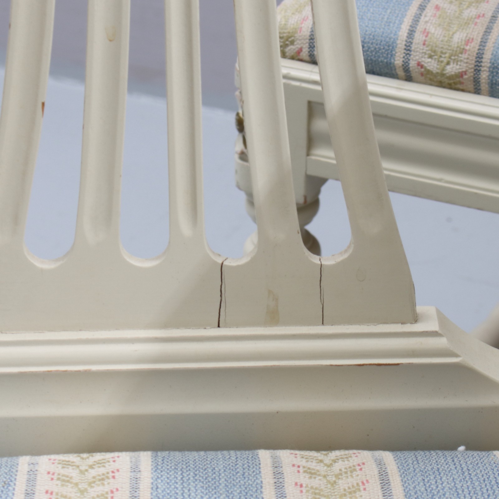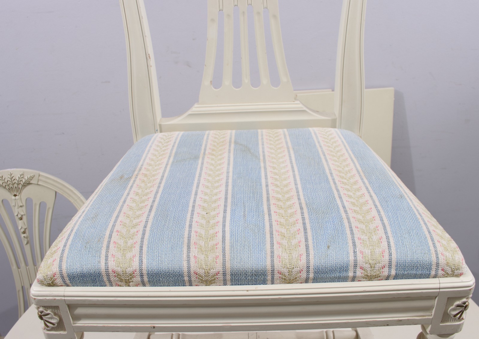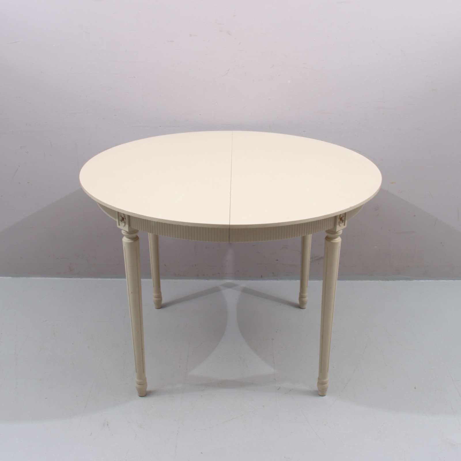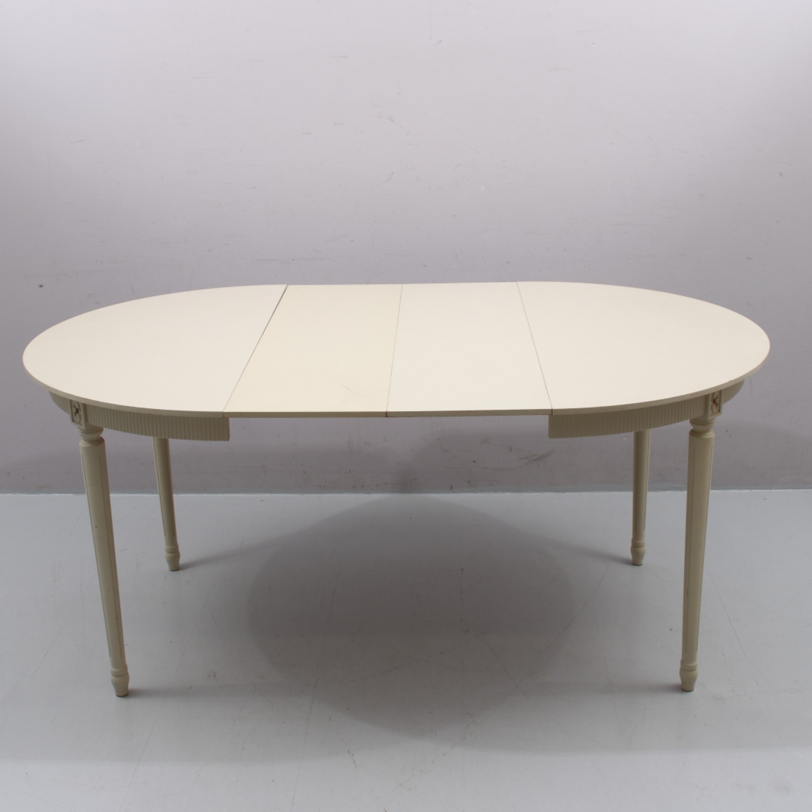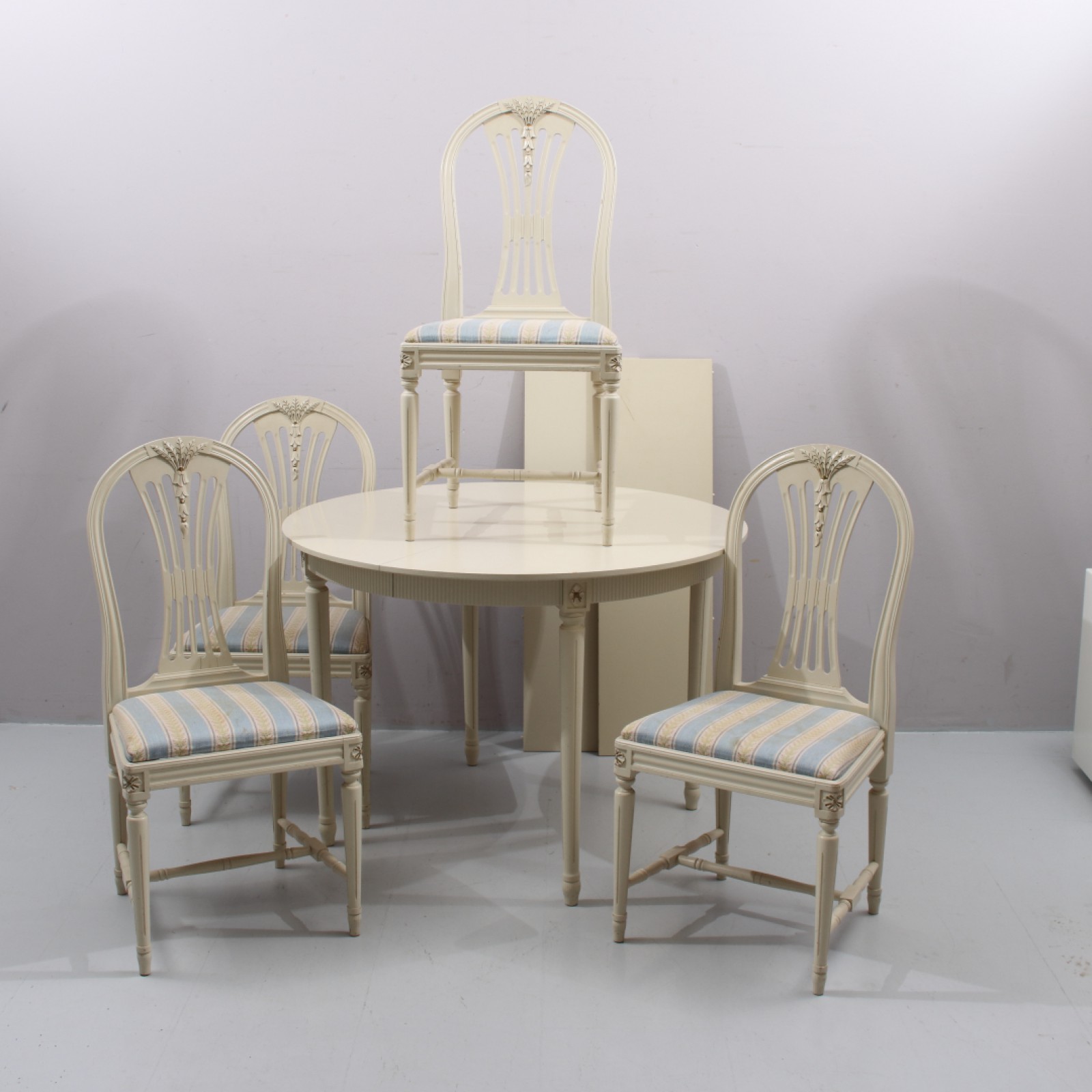 MATGRUPP "AXET" GUSTAVIANSK STIL 5 delar, 4st stolar samt 1st bord med 2st extra iläggsskivor, 1900-talets andra hälft, bruksslitage, stol Rh.96, B.47, Sh.47 cm, bord H.73,5, L.105+30+30, B.105 cm. (vån1) Avslutas 2026-02-15 18:00:00