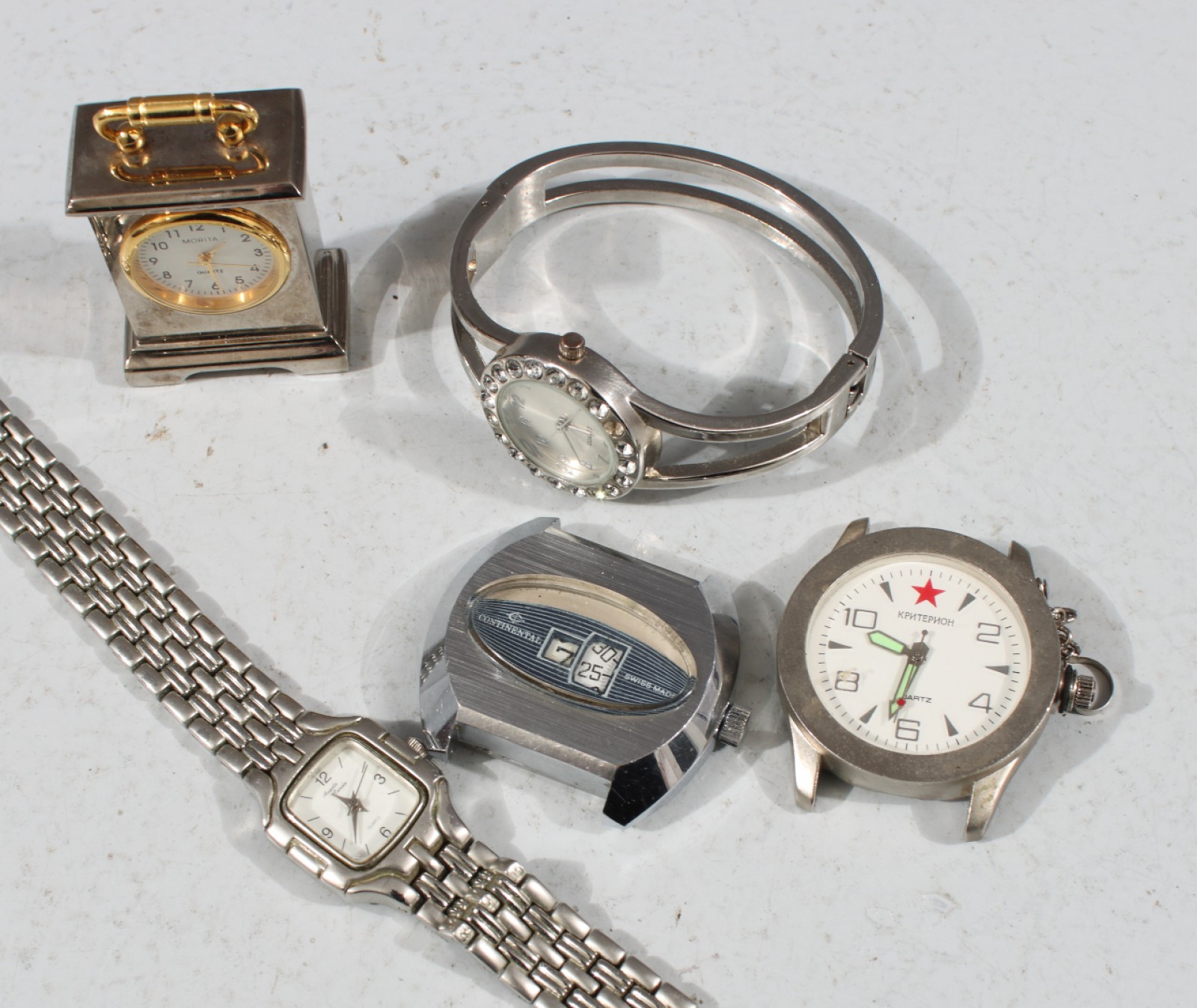 CONTINENTAL ECONOMIC ARMBANDSUR M.FL 5 stycken, 1st manuell Continental Economic (gångbar vid kontroll), 1st quartz herrur, 2st damur samt 1st mindre bordsur quartz (ej gångbara vid kontroll), bredd 22-42 mm. (vån3) Avslutas 2026-02-22 18:17:00