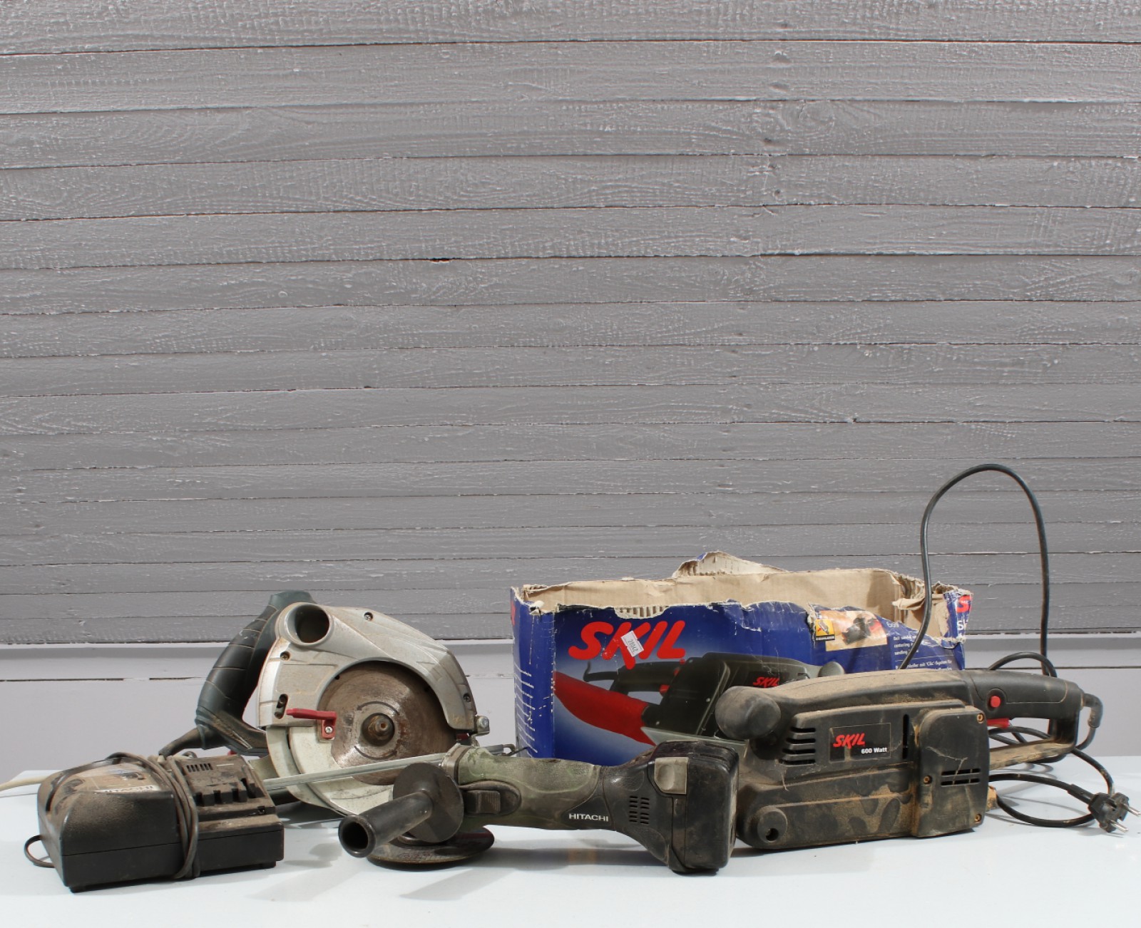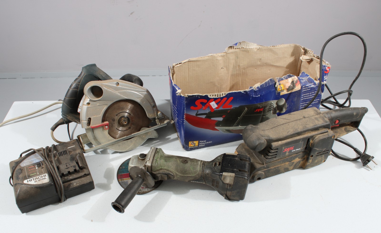 3 stycken, 1st batteridriven Hitachi G14DSL vinkelslip med laddare, 1st elektrisk Alpha Tools AHS 66/2 cirkelsåg samt 1st elektrisk Skil 7675 bandslipmaskin, samtliga fungerar vid test, smutsiga, bruksslitage. (vån3)