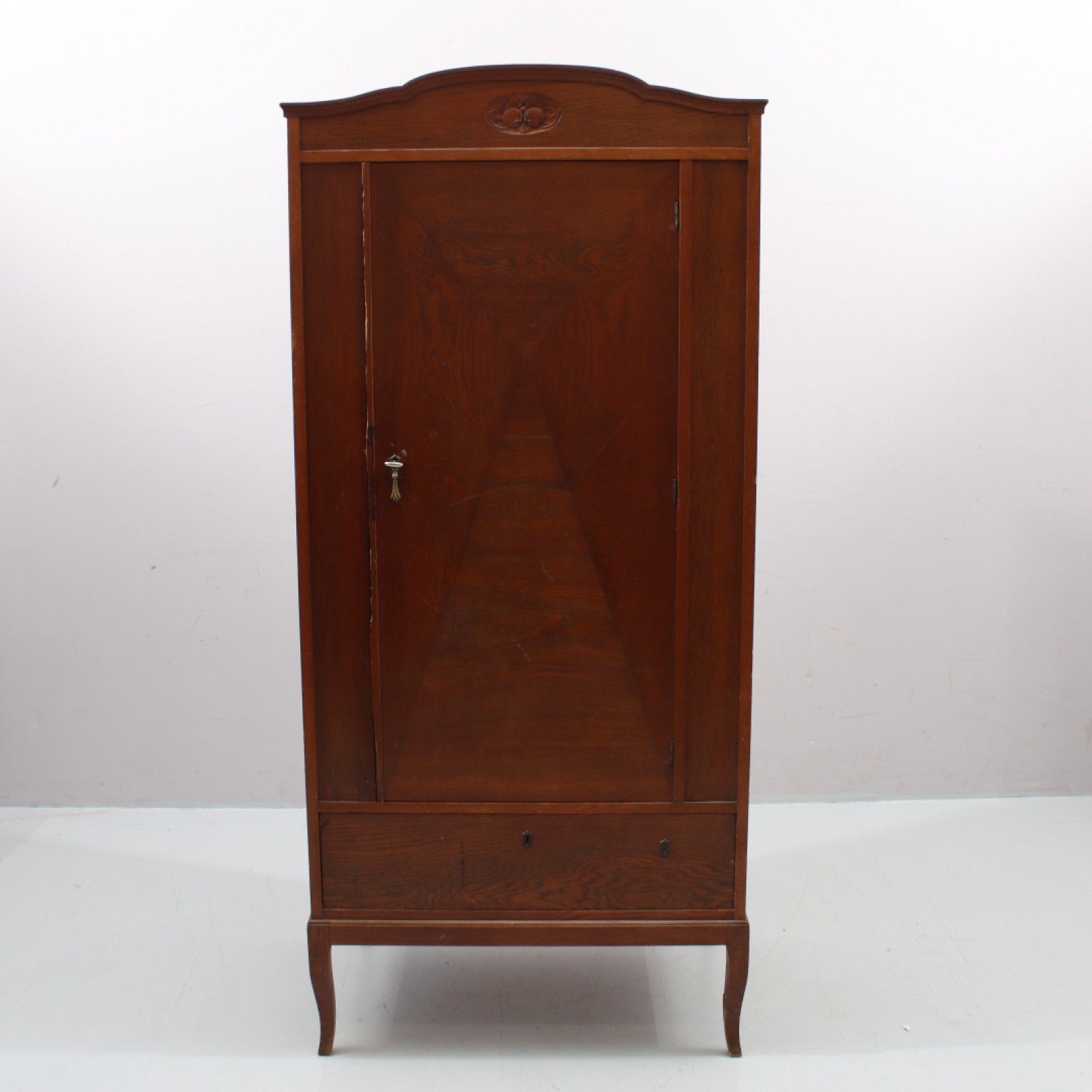 SKÅP Fanerat med ek, krön med skuren dekor "Äpplen", 1920,30-tal, åldersrelaterat slitage dock dörrlist med skada (se bilder), H.180, B.80, Dj.50 cm. (vån1) Avslutas 2026-02-22 18:12:00