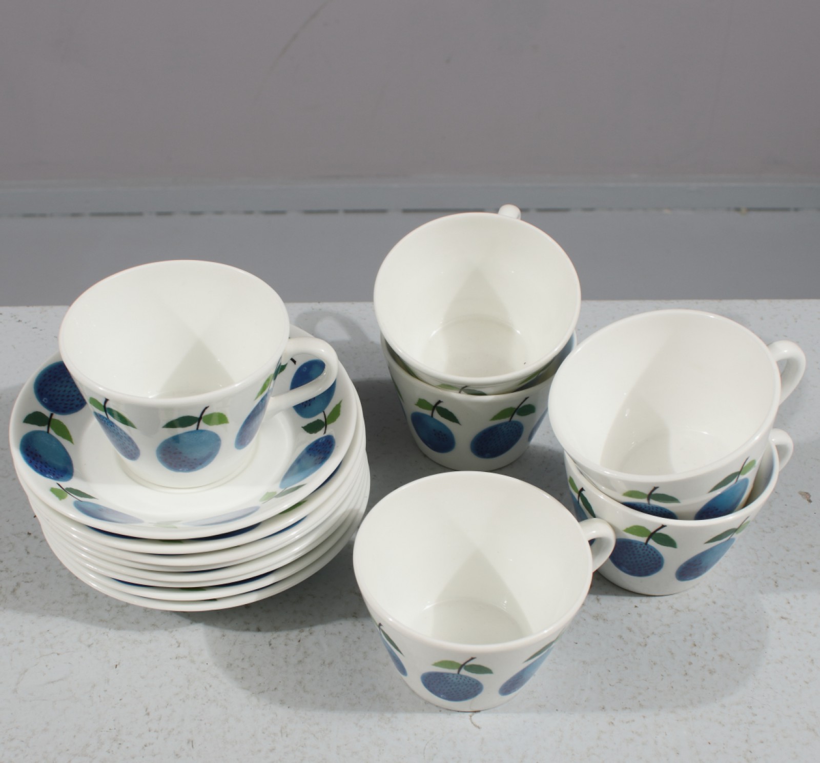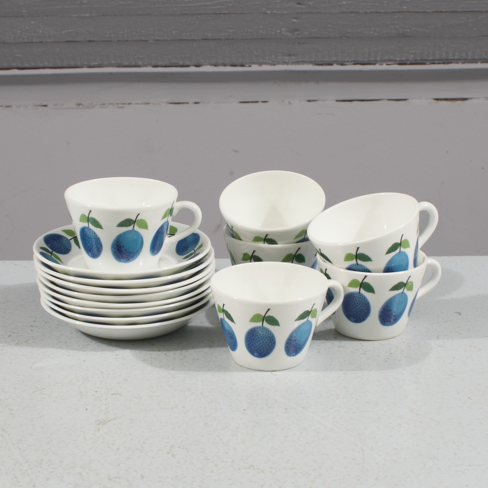 STIG LINDBERG "PRUNUS" KAFFEKOPPAR MED FAT, GUSTAVSBERG 14 delar, 6st kaffekoppar samt 8st kaffefat, höjd kopp 5,5 cm, diameter fat 12,5 cm. (vån3) Avslutas 2026-04-05 18:04:00
