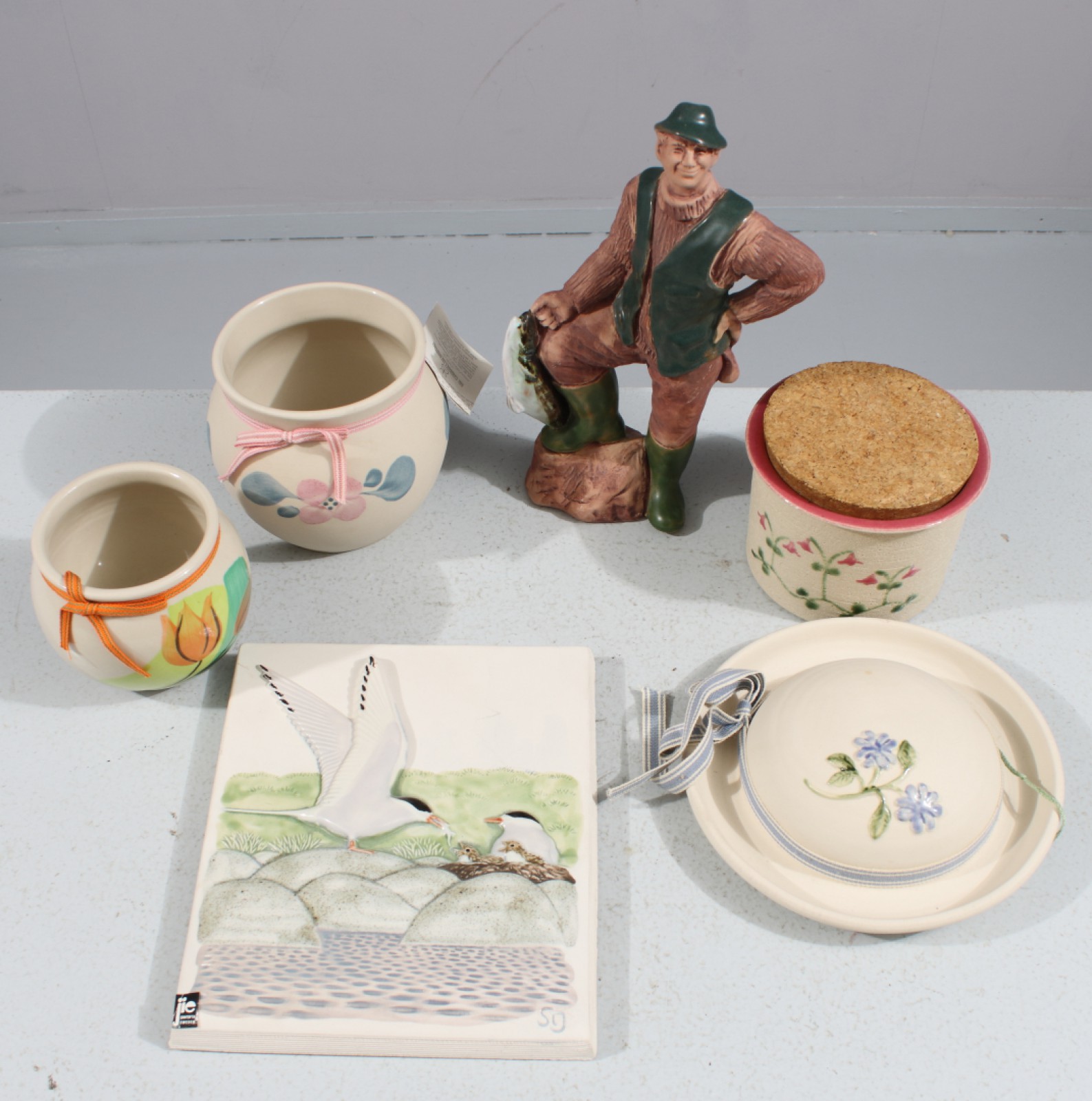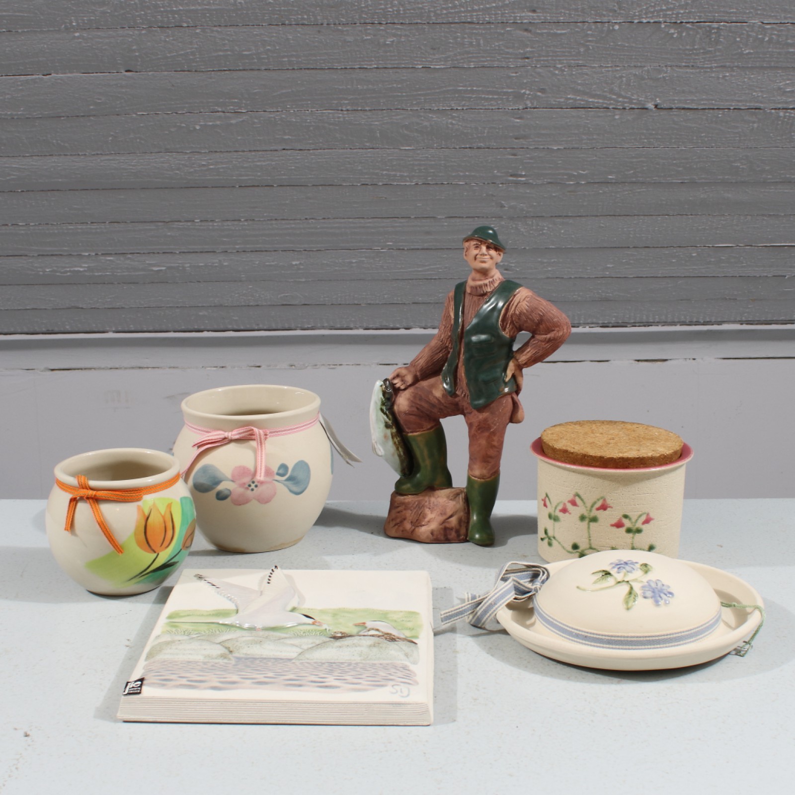 GABRIEL OCH JIE KERAMIKFÖREMÅL 6 delar, 1st figurin "Fiskargubbe", 2st reliefer samt 3st krukor, höjd 26,5 cm och lägre. (vån3) Avslutas 2026-04-05 18:09:00
