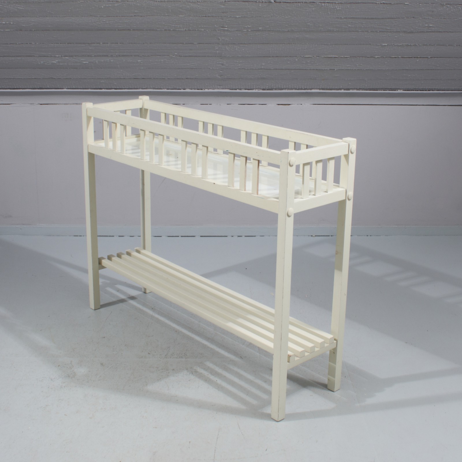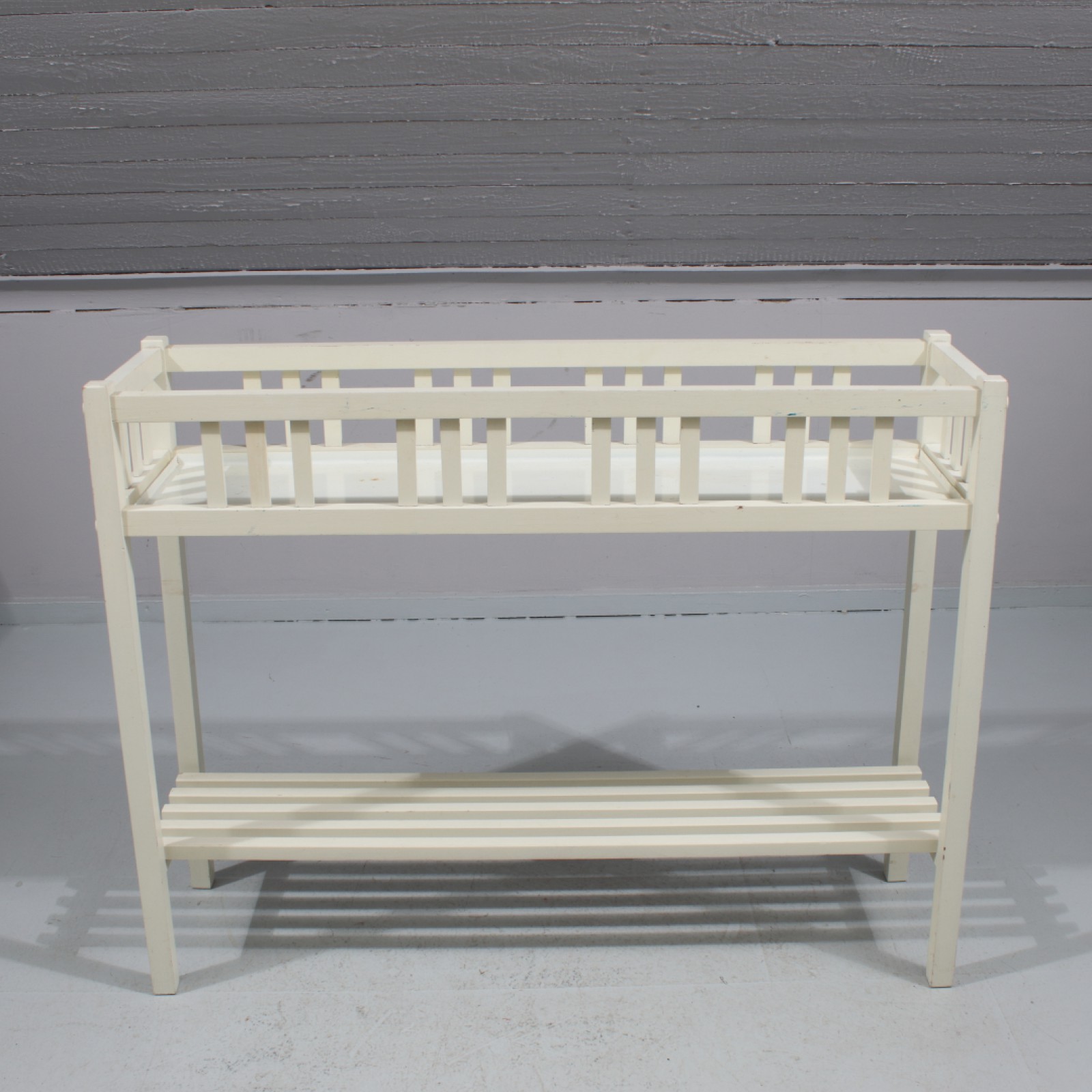 BLOMBÄNK Bemålat trä, botten med plåtskiva, mindre bruksslitage, H.75, L.95, B.26 cm. (vån3) Avslutas 2026-04-05 18:00:00