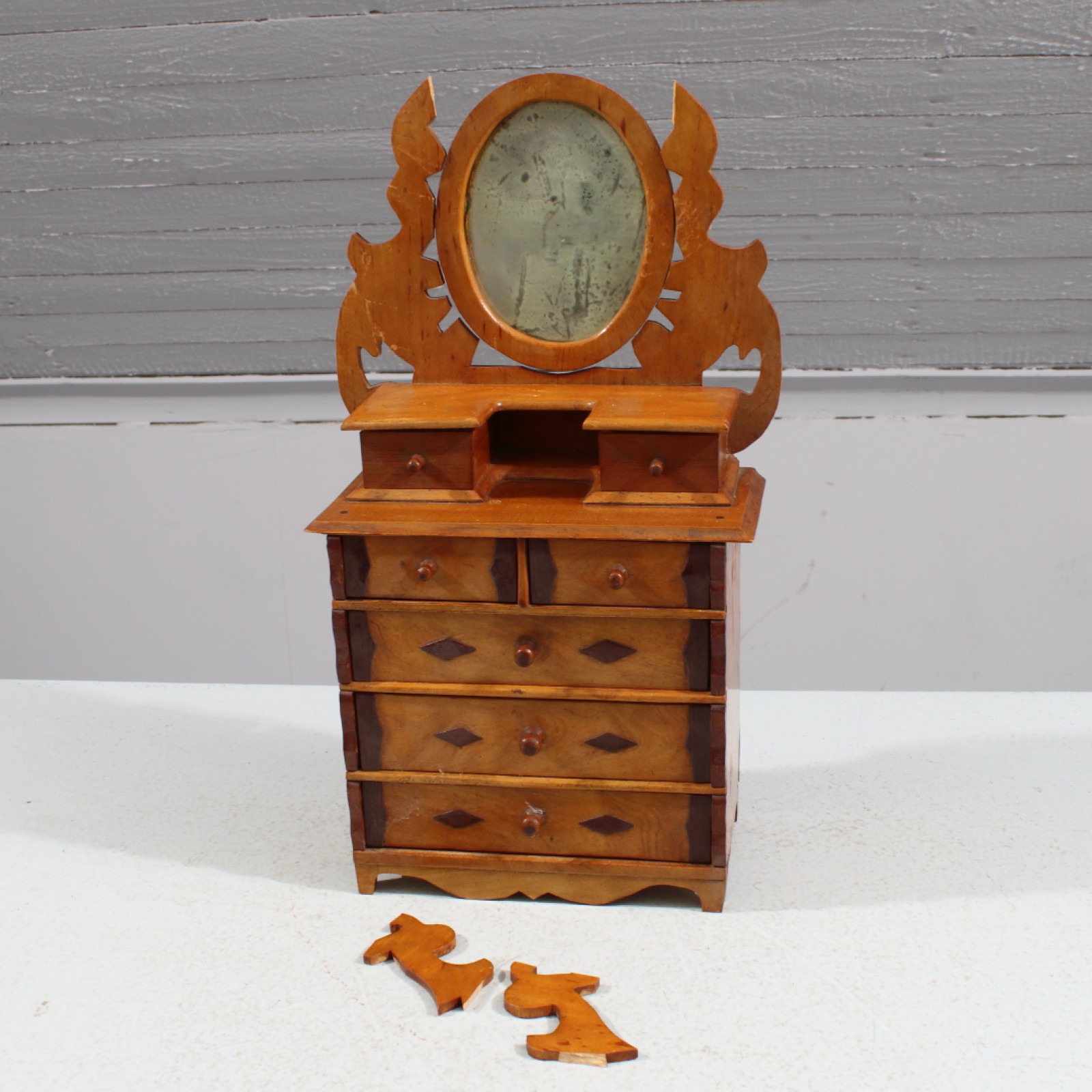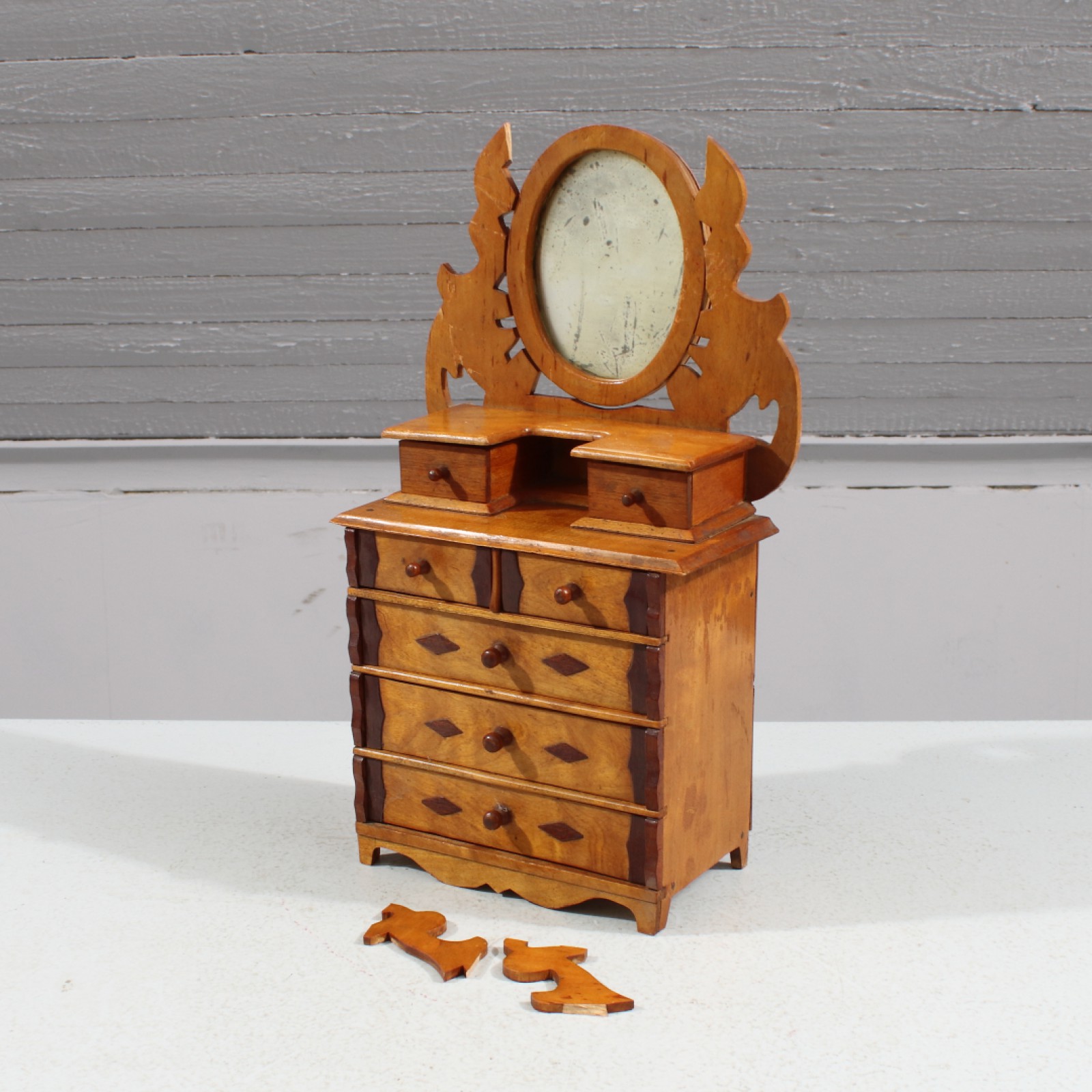 DOCKMÖBEL "BYRÅ MED SPEGELUPPSATS" 1900-tal, krön med avslag (delar medföljer), höjd 35 cm. (vån3) Avslutas 2026-04-19 18:16:00