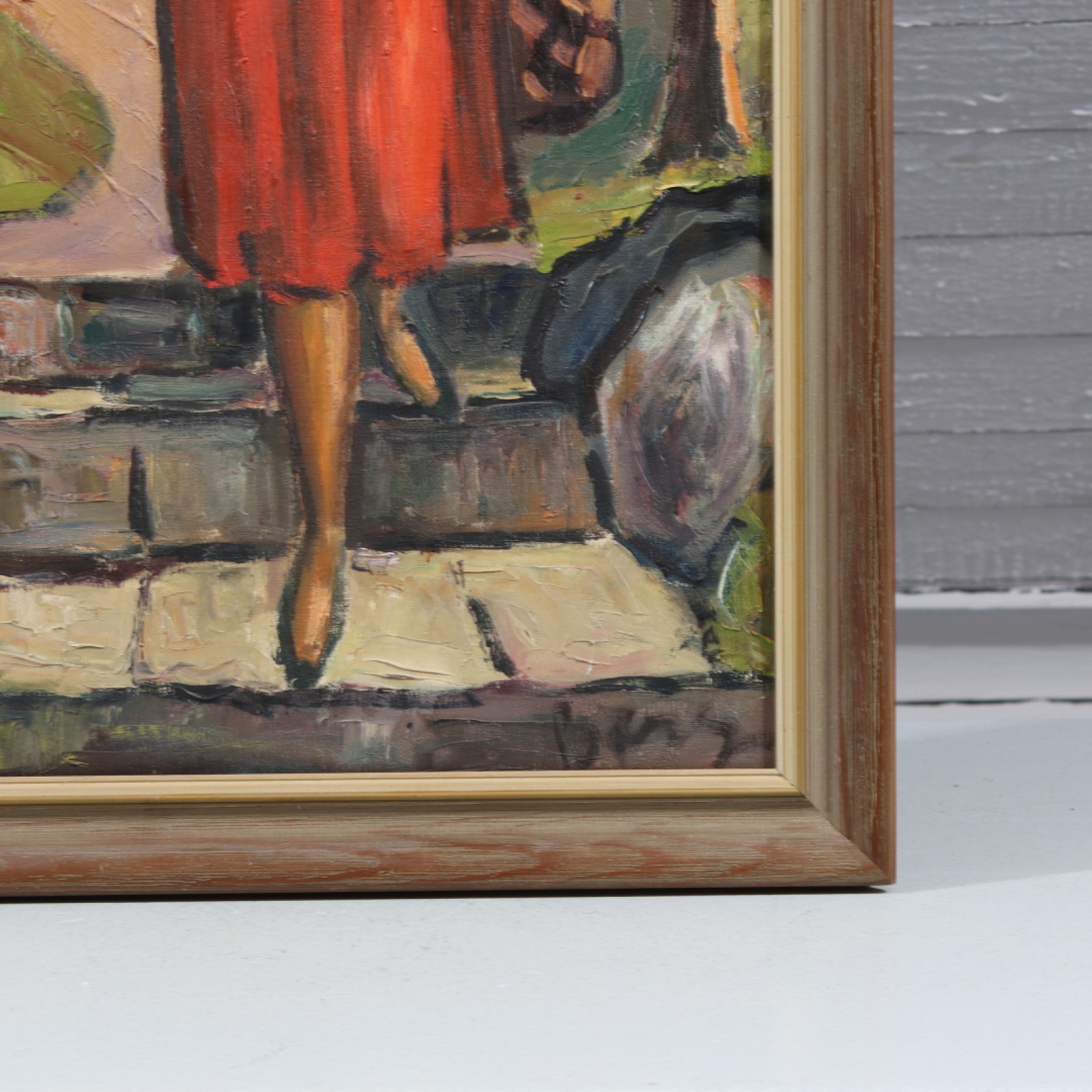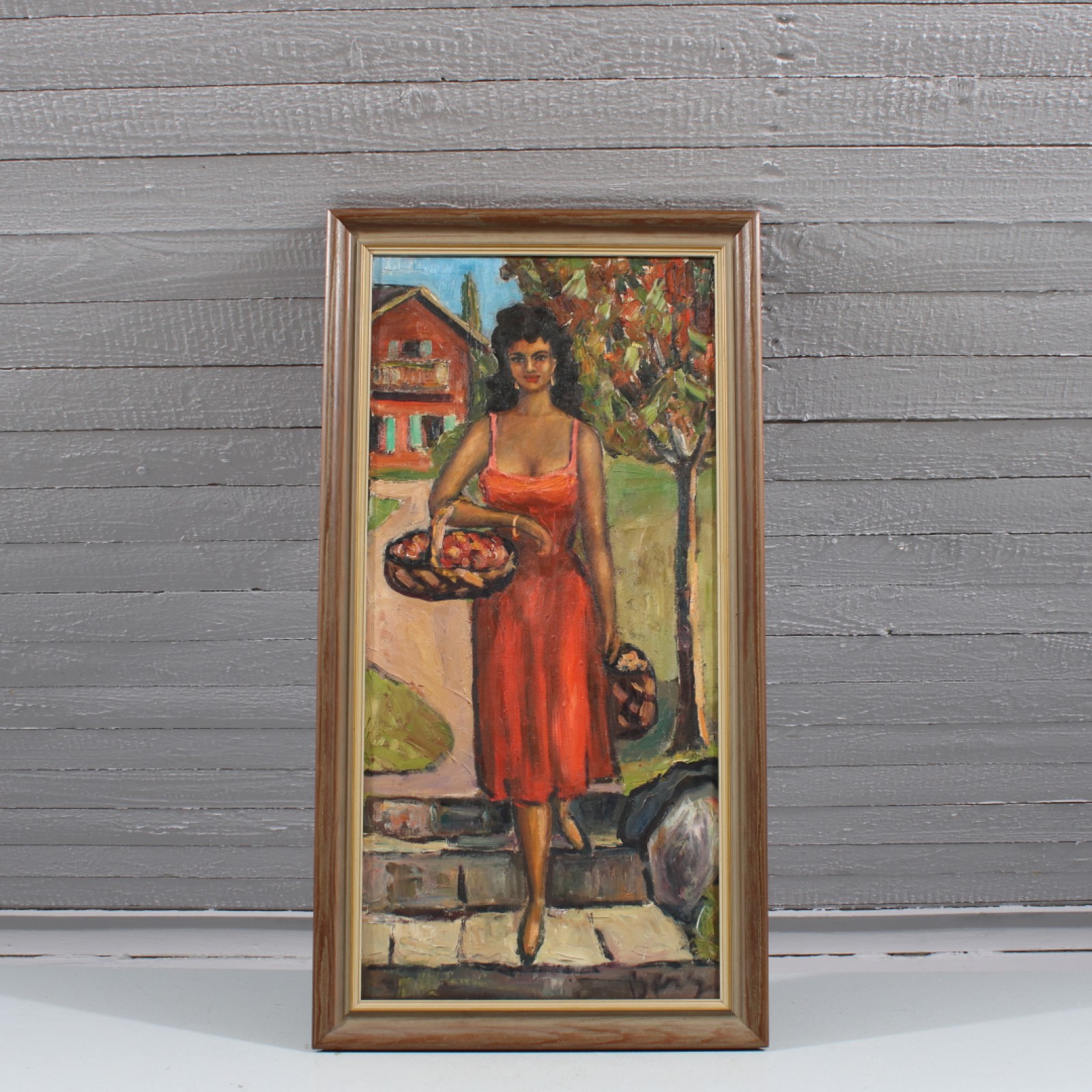 OIDENTIFIERAD KONSTNÄR Olja på duk, "Kvinna med korgar", signerad, ram 74x39 cm, bild 66x31 cm. (vån3) Avslutas 2026-04-19 18:17:00