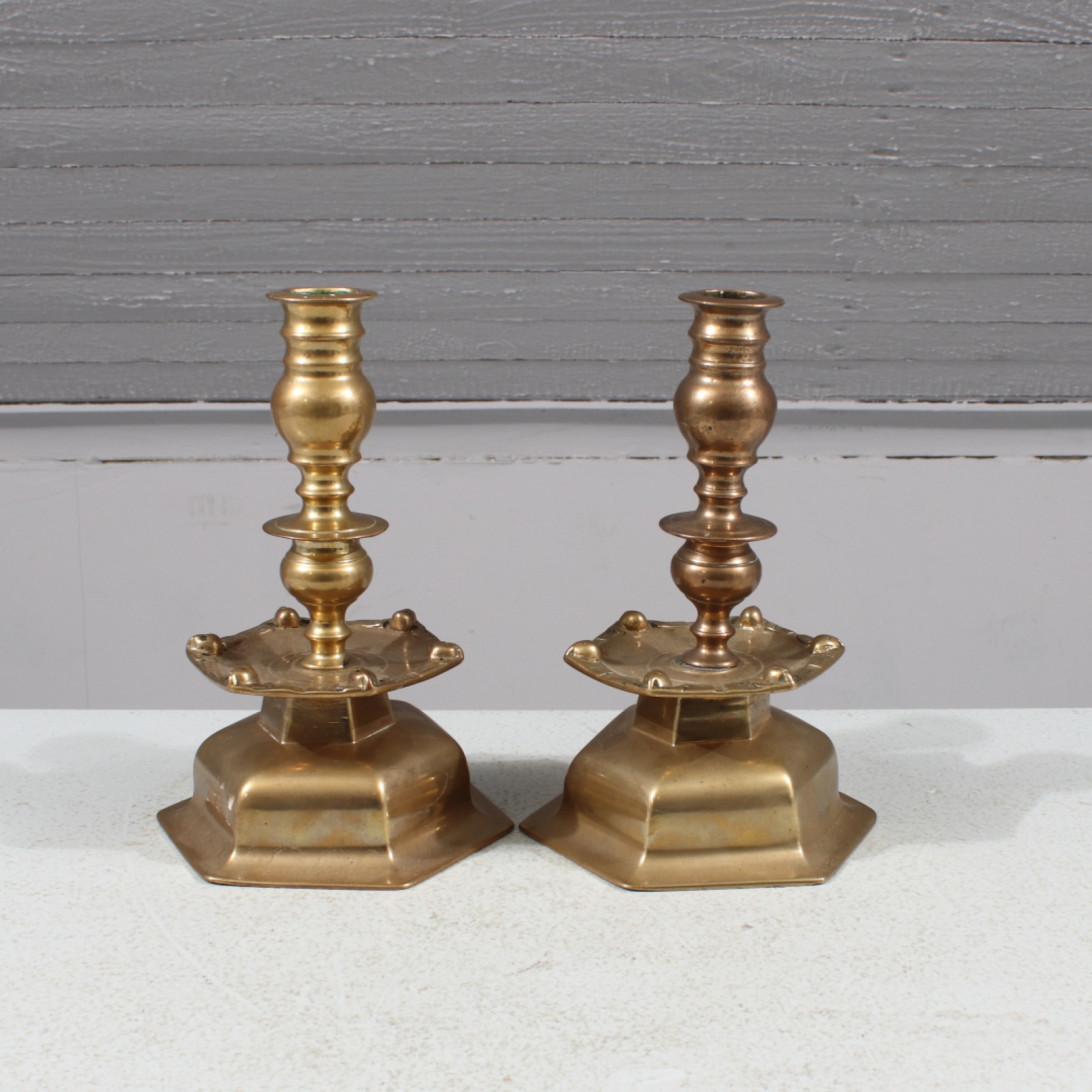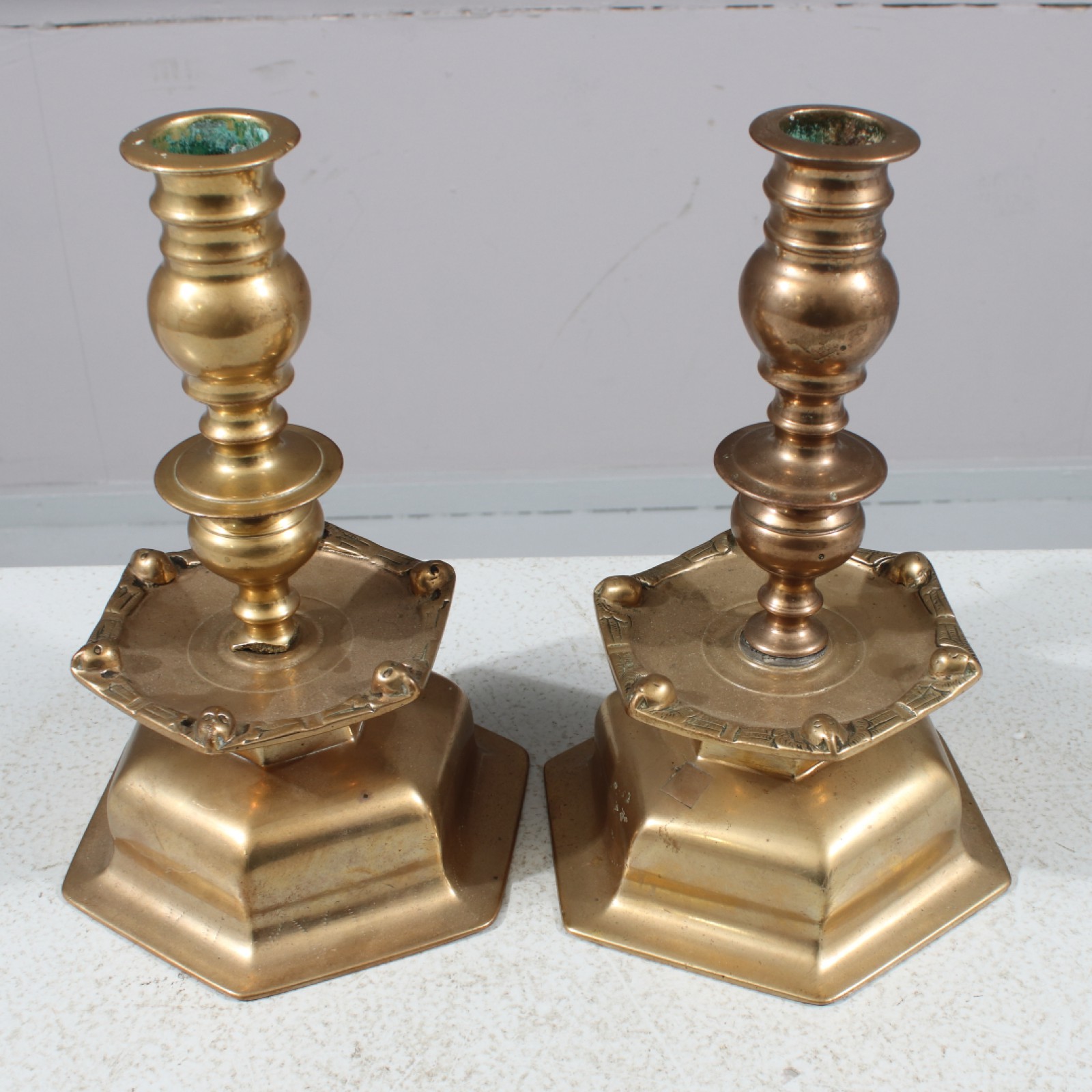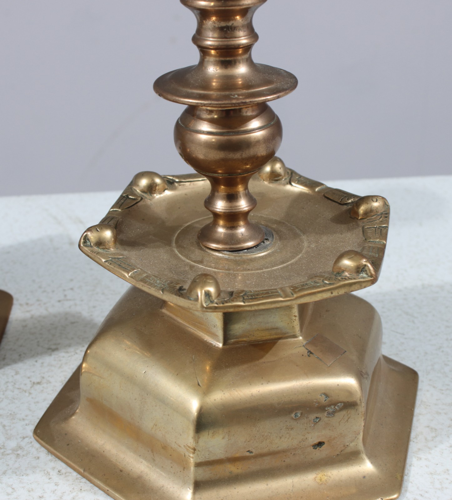 LJUSSTAKAR BAROCK 1600-TAL 2 stycken (1 par), malm/mässing, 1st med avslag vid fäste på pipa (se bild), höjd 23 cm. (vån3) Avslutas 2025-12-07 18:10:00