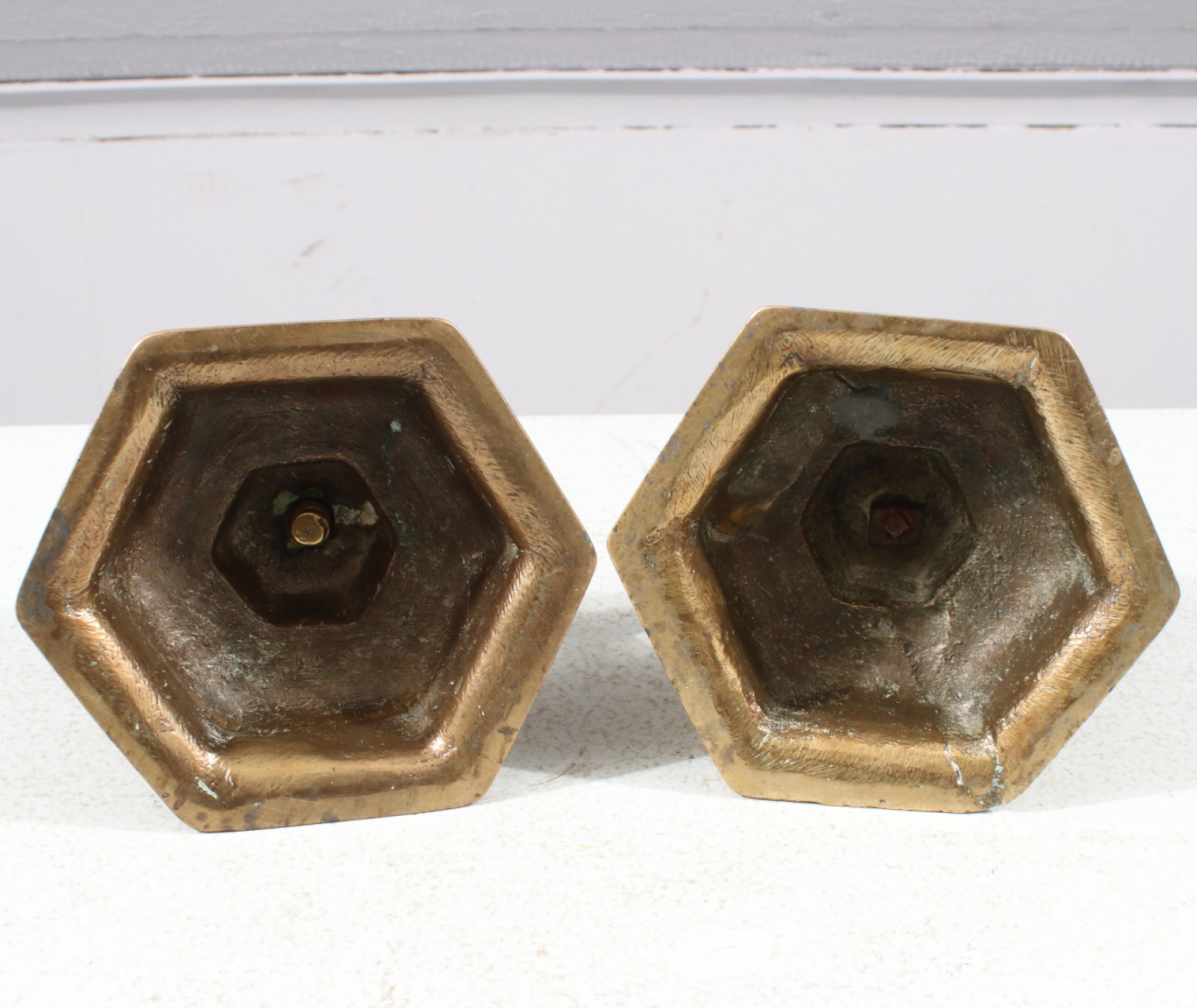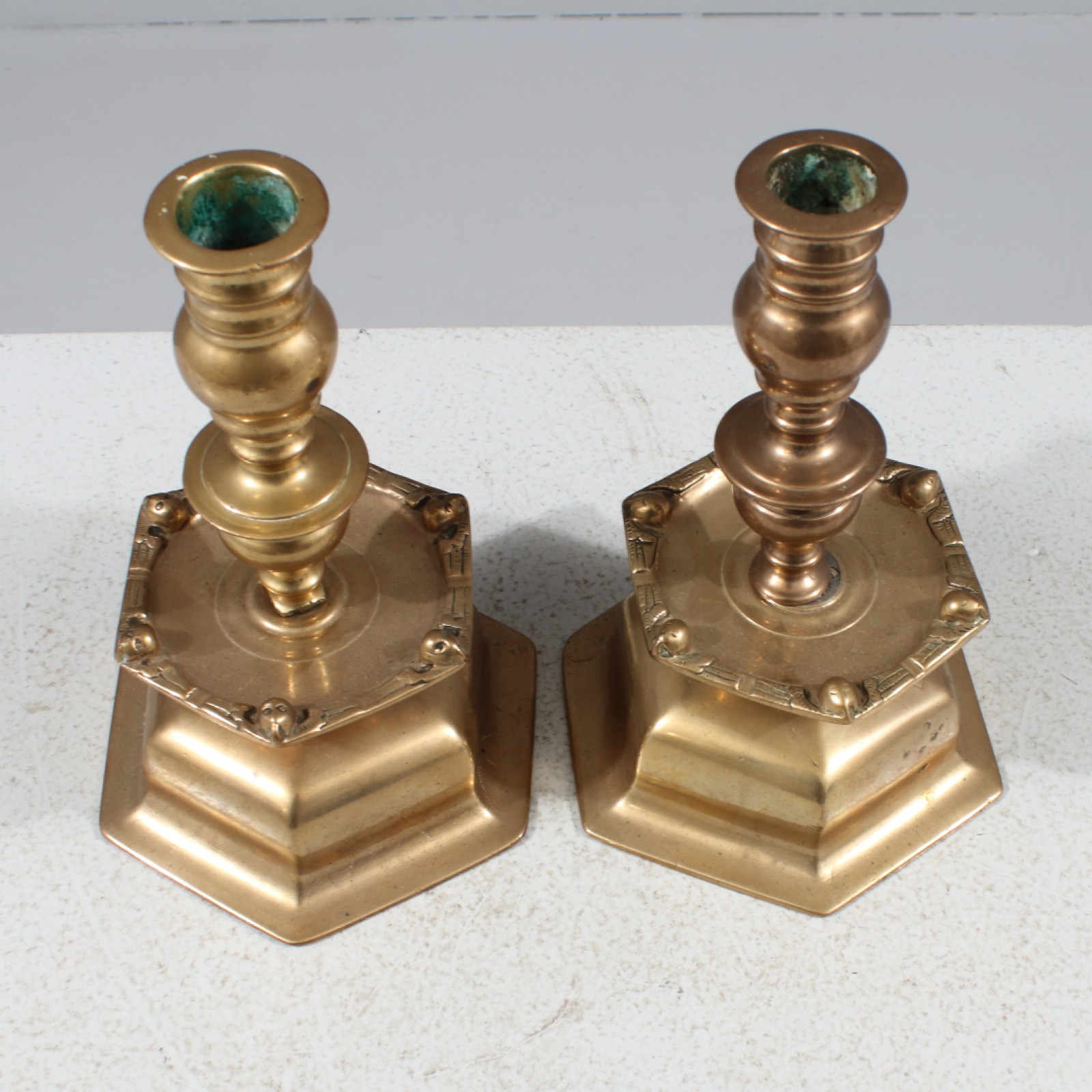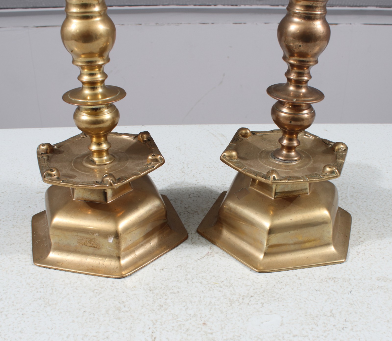 LJUSSTAKAR BAROCK 1600-TAL 2 stycken (1 par), malm/mässing, 1st med avslag vid fäste på pipa (se bild), höjd 23 cm. (vån3) Avslutas 2025-12-07 18:10:00