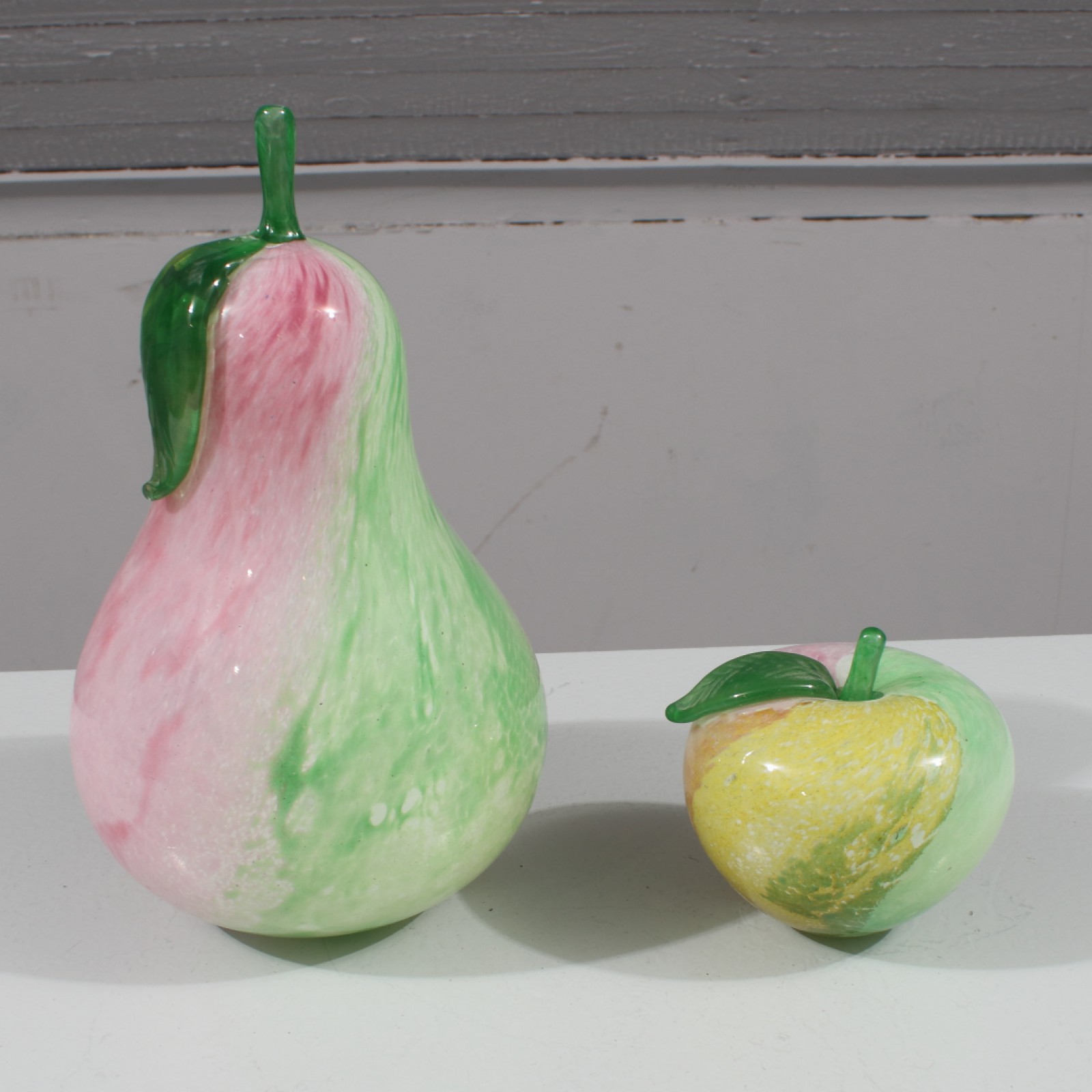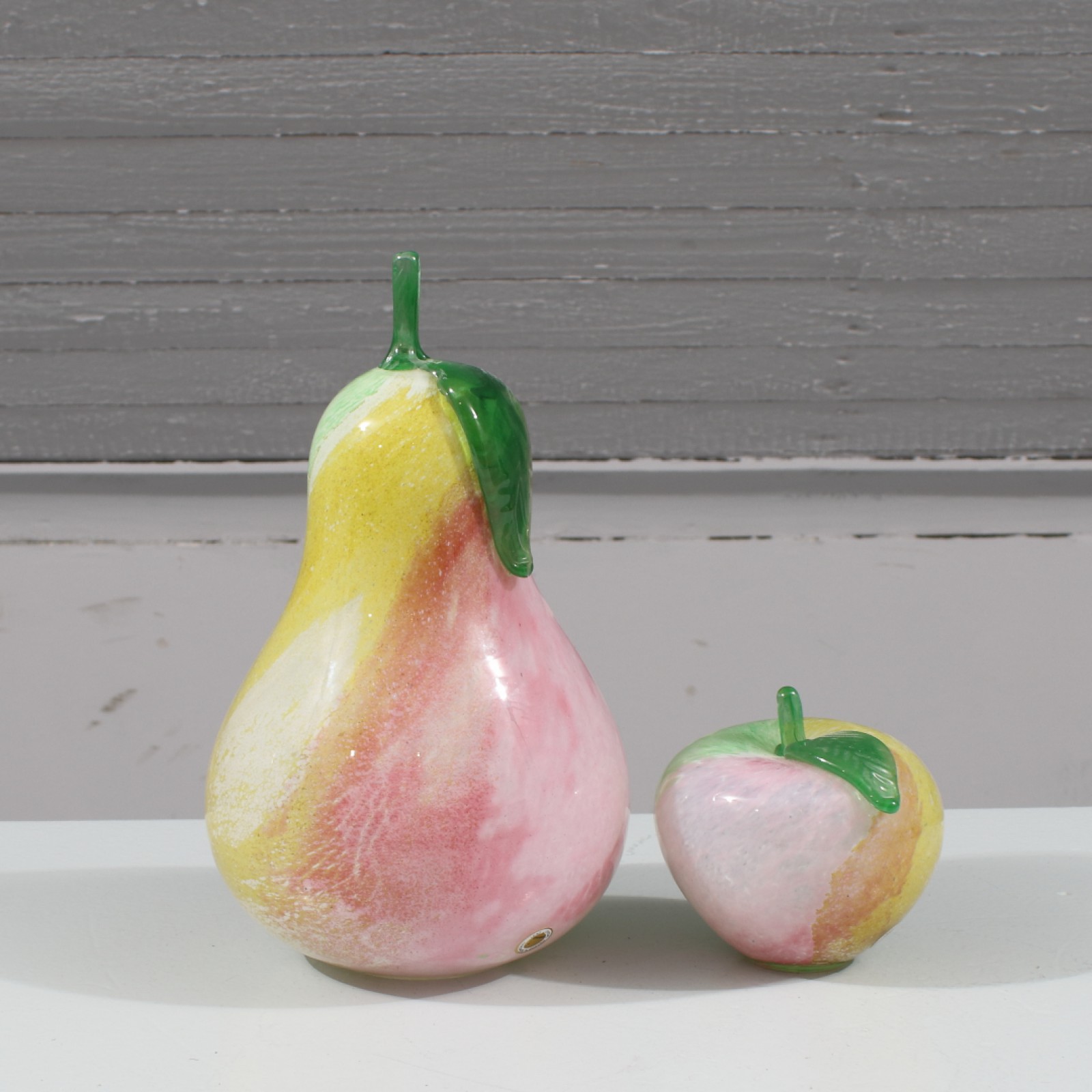 GRÄNNA GLAS "GLASFRUKTER" 2 stycken, konstglas, päron med mindre nagg på blad, höjd 10-25 cm. (vån3) Avslutas 2026-01-25 18:00:00