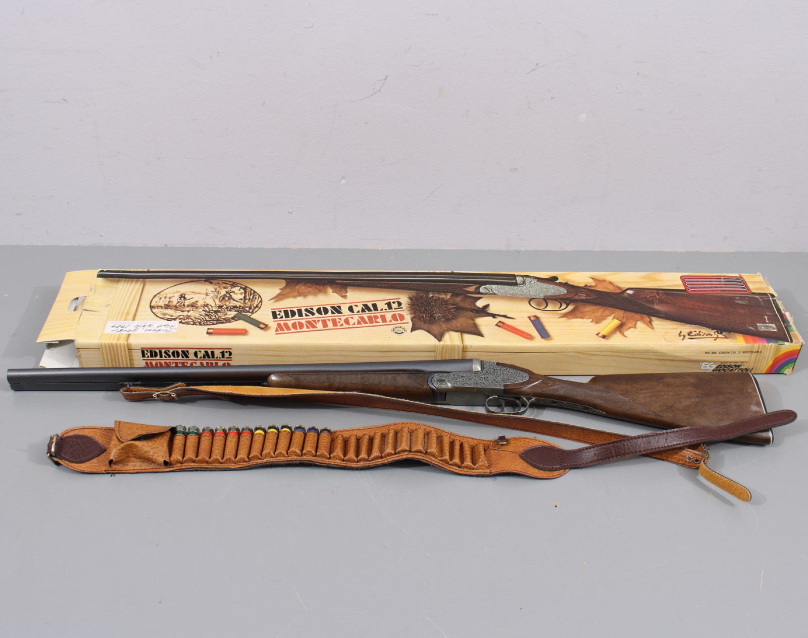 LEKSAKSGEVÄR Edison cal.12 Monte Carlo, metall och plast, patronbälte med patroner medföljer, inköpt 1989, originalkartong medföljer, gott skick, längd 83,5 cm. (vån3) Avslutas 2026-01-25 18:04:00