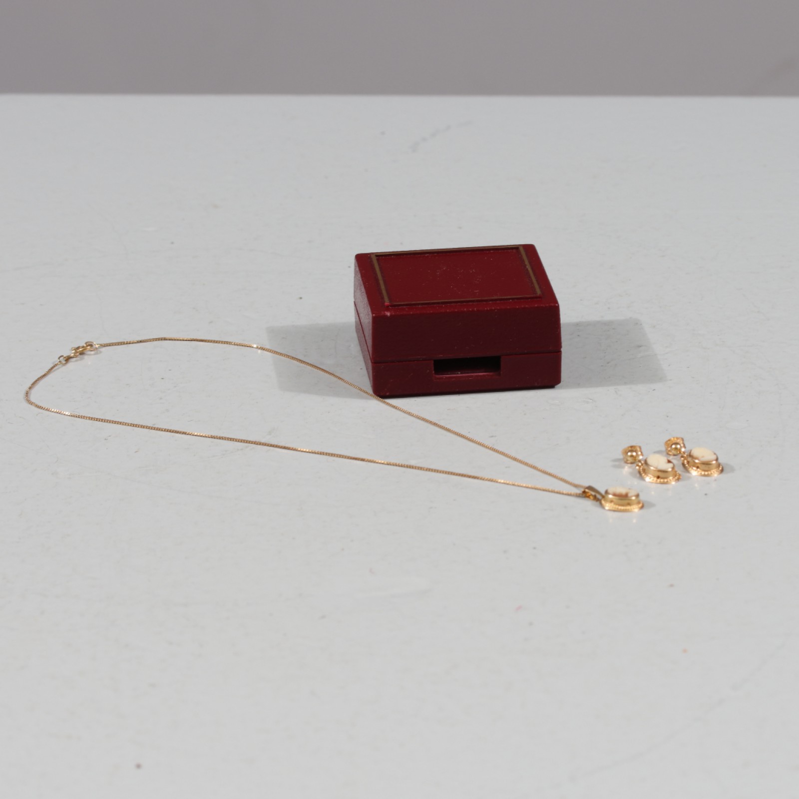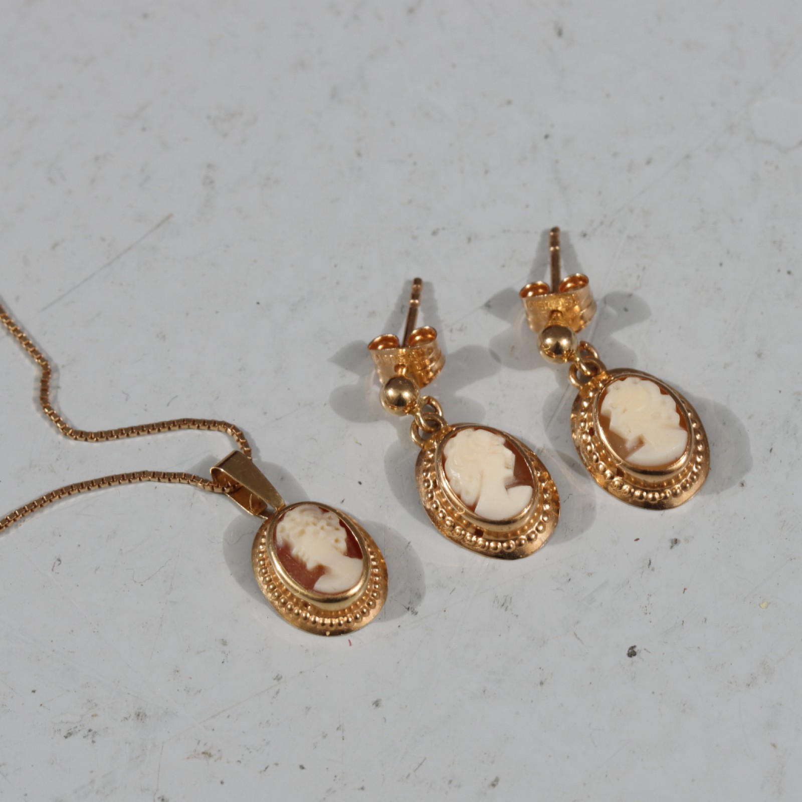 SMYCKESET I 18K GULD MED CAMÉ 3 delar, 1st halsband med caméhänge samt 1 par örhängen med camé, längd halsband 36 cm, örhängen 12x9 mm, bruttovikt 3,40 gram. (vån3) Avslutas 2026-02-08 18:03:00