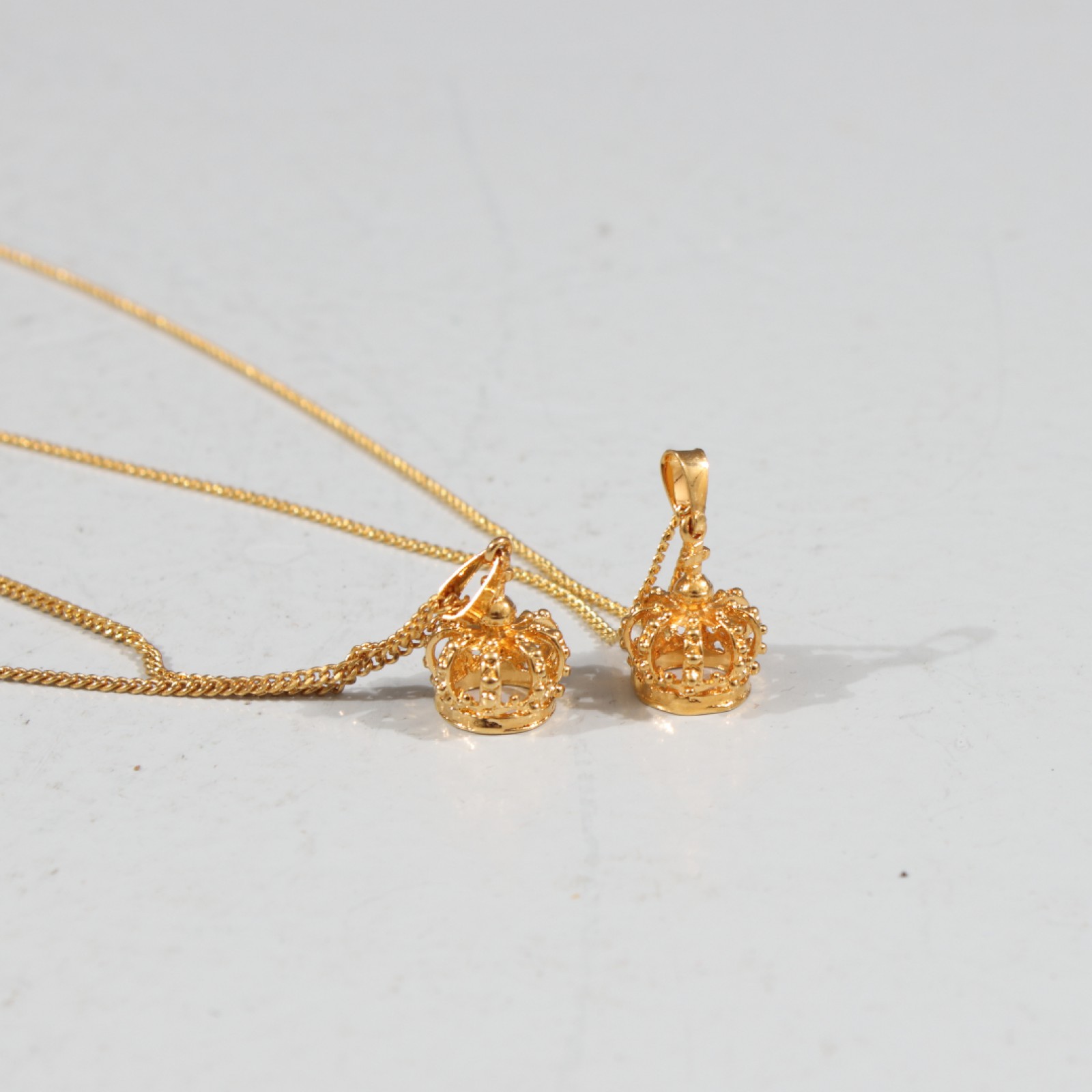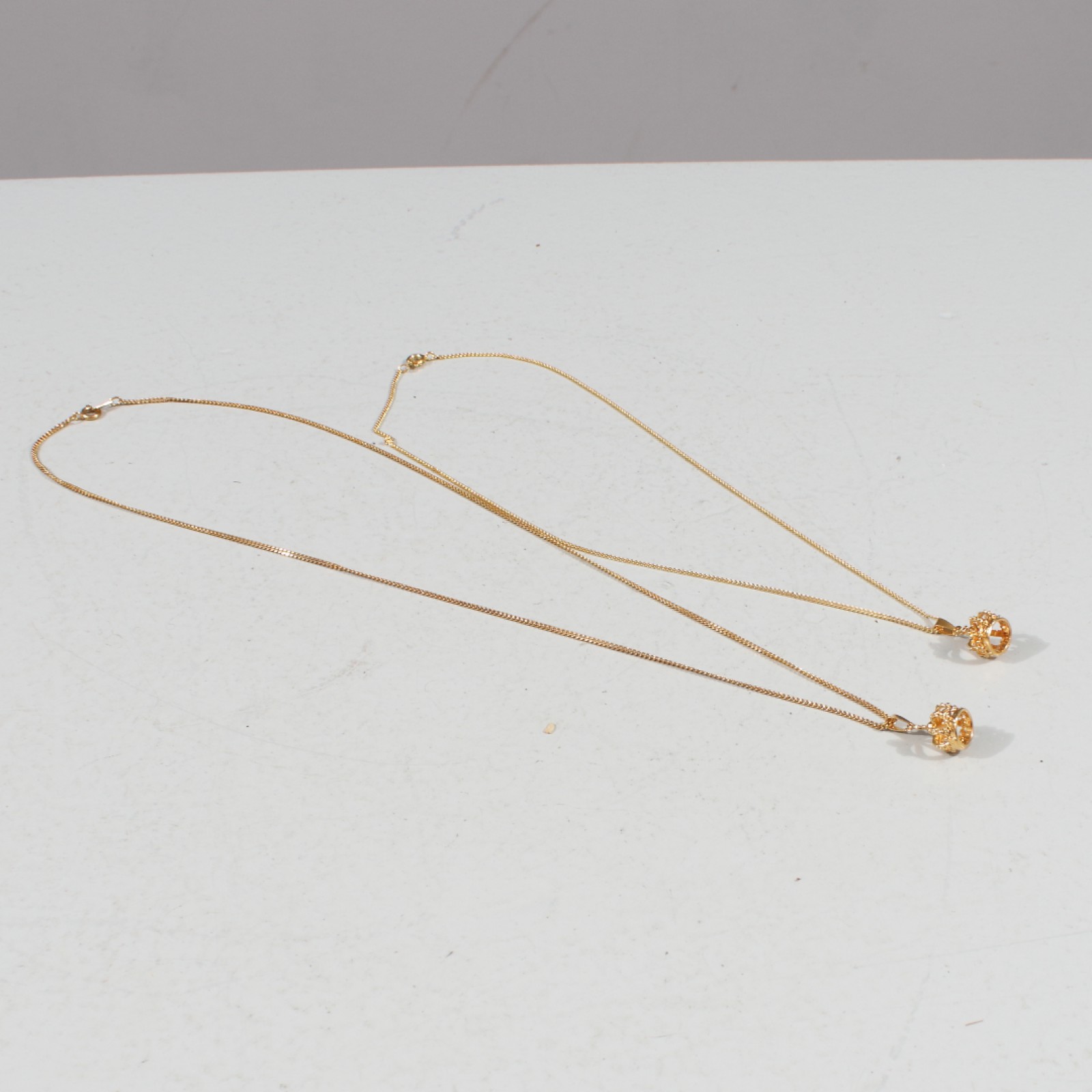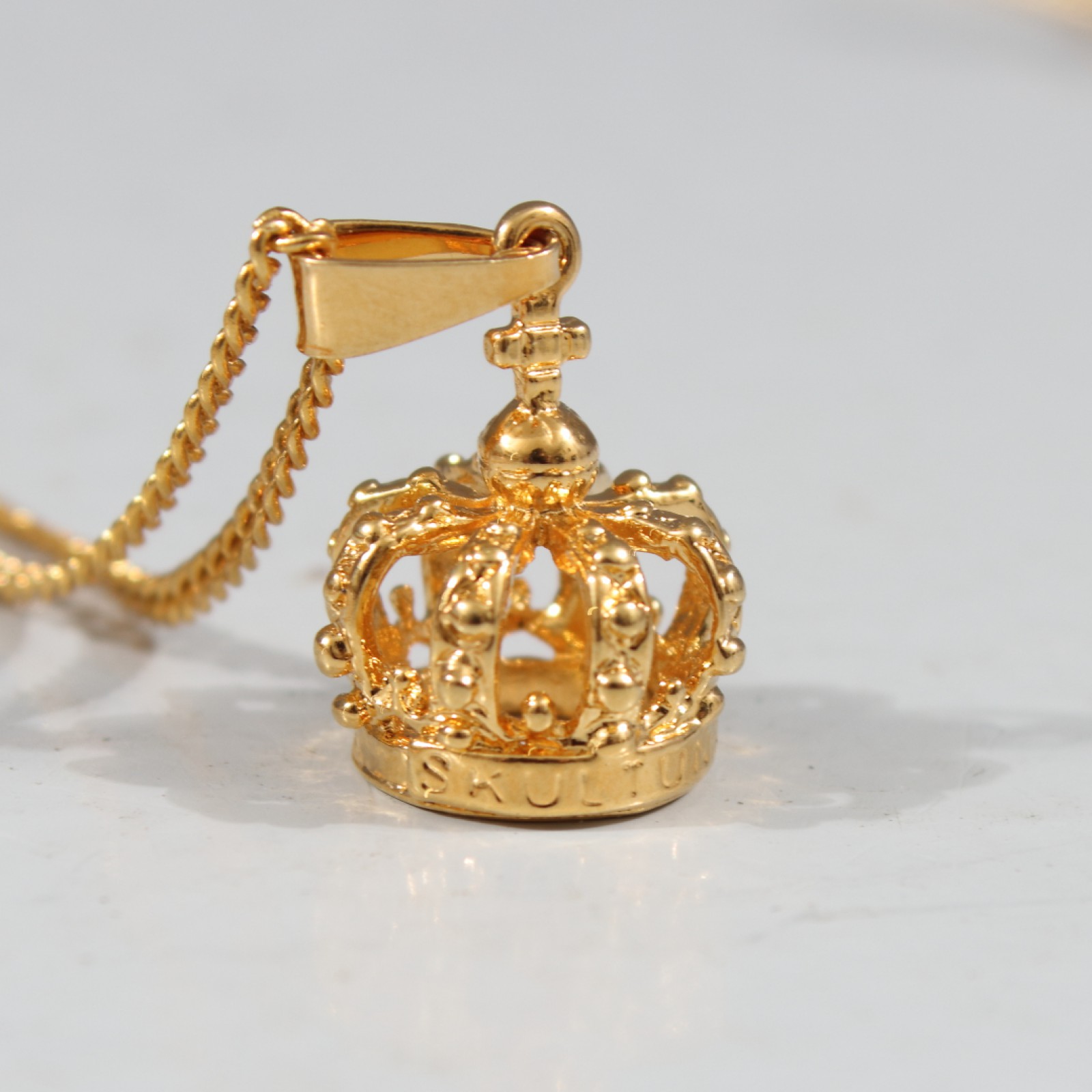 COLLIER MED HÄNGE "SKULTUNA KRONA" 2 stycken halsband med hängen "Skultuna krona", förgylld metall, halsband längd 44-58 cm. (vån3) Avslutas 2026-02-08 18:03:00