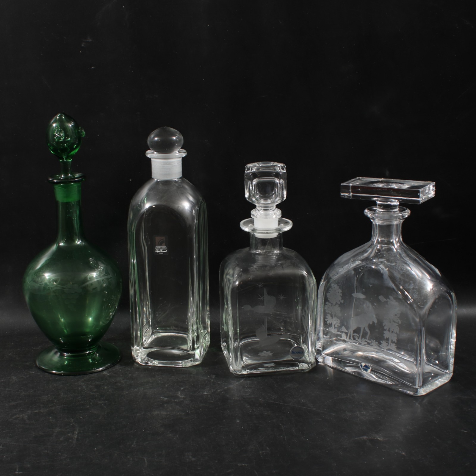 KARAFFER 4 stycken, 3st med slipad dekor, bl.a Karlskoga Kristallsliperi och Books i Kosta, höjd 21-28 cm. (vån3) Avslutas 2026-02-08 18:04:00