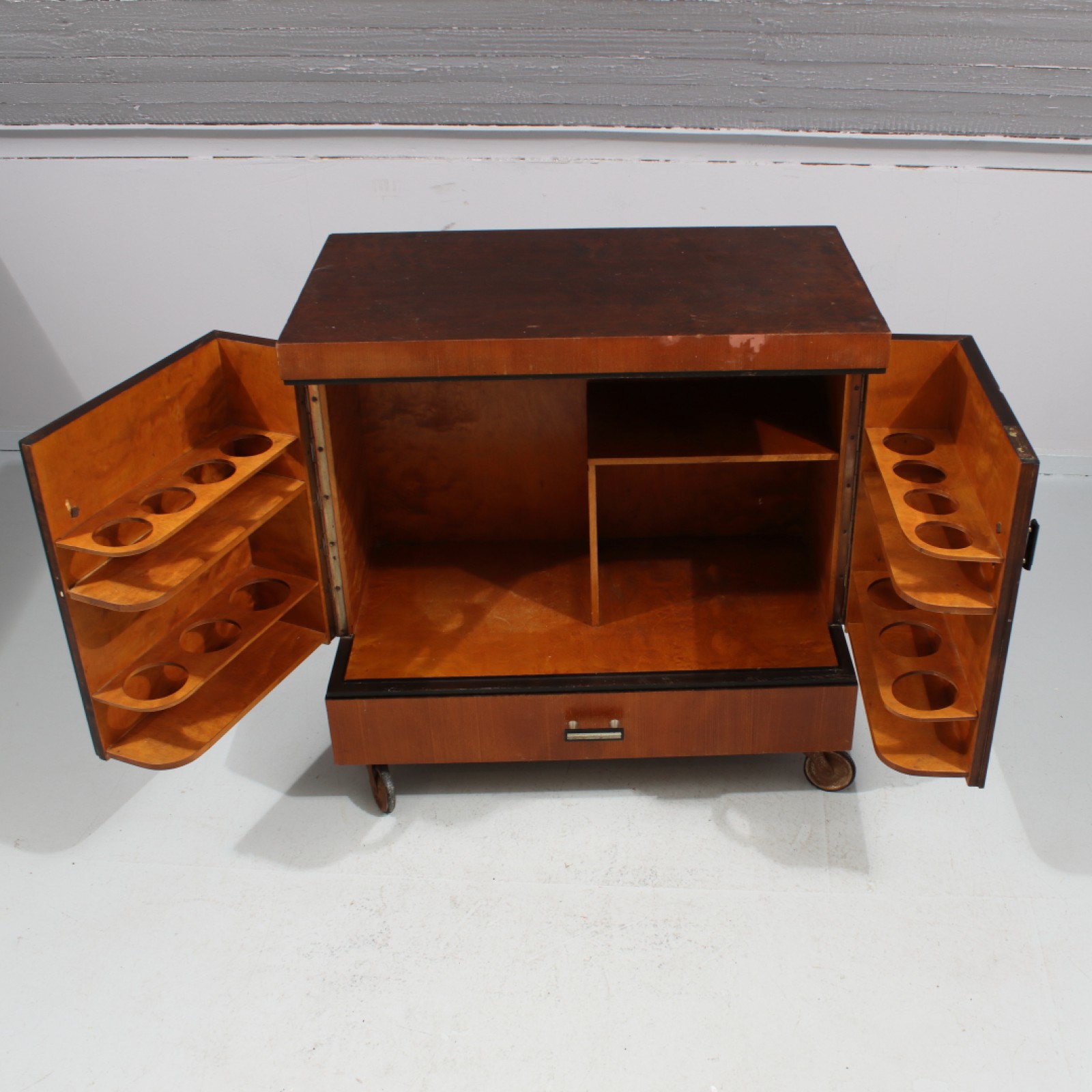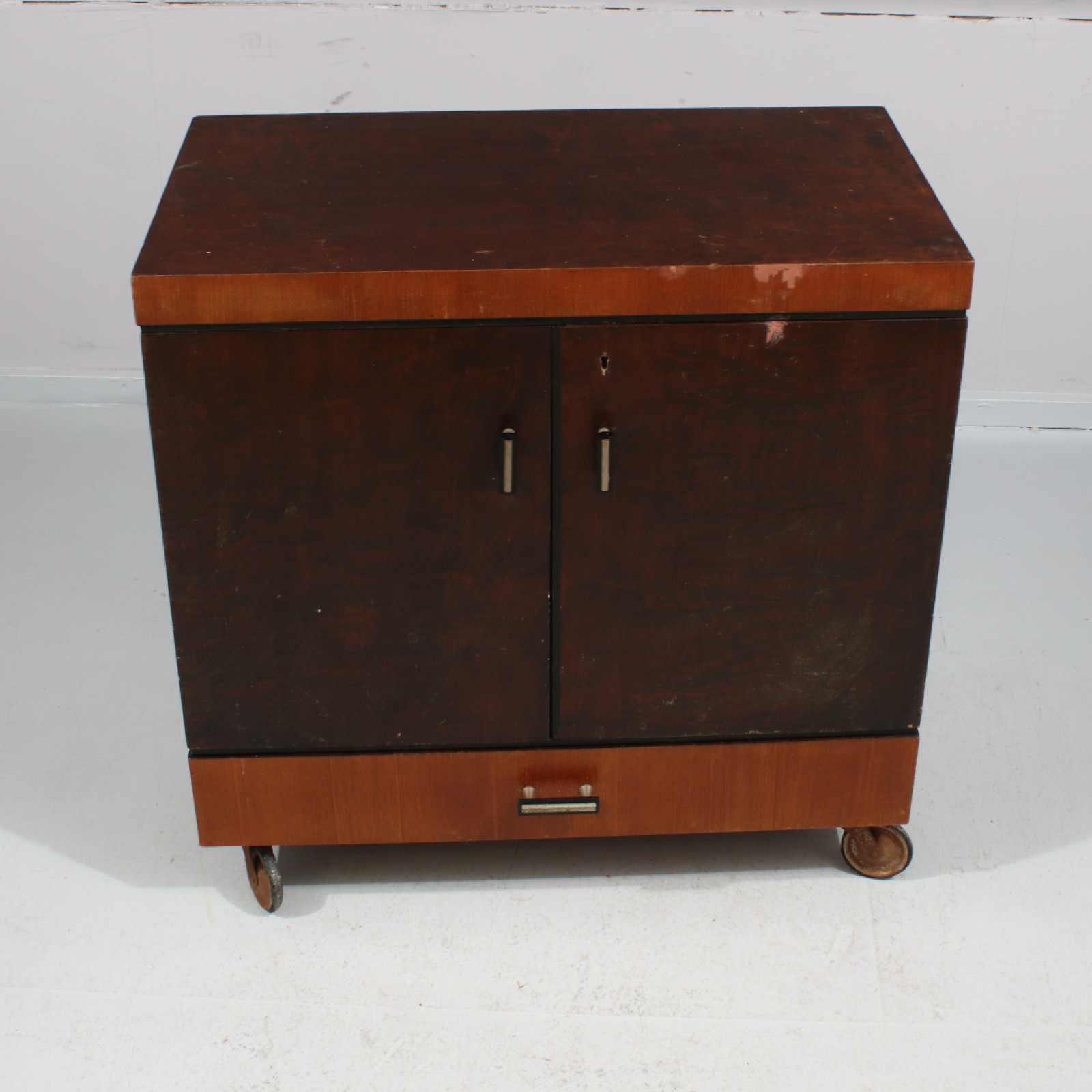 BARSKÅP ART DECO Fanerat med olika träslag, 1930-tal, upplåst men nyckel saknas, ställvis med fanerskador, gummi på hjul med skador, H.71, B.70, Dj.40 cm. (vån3) Avslutas 2026-03-22 18:11:00