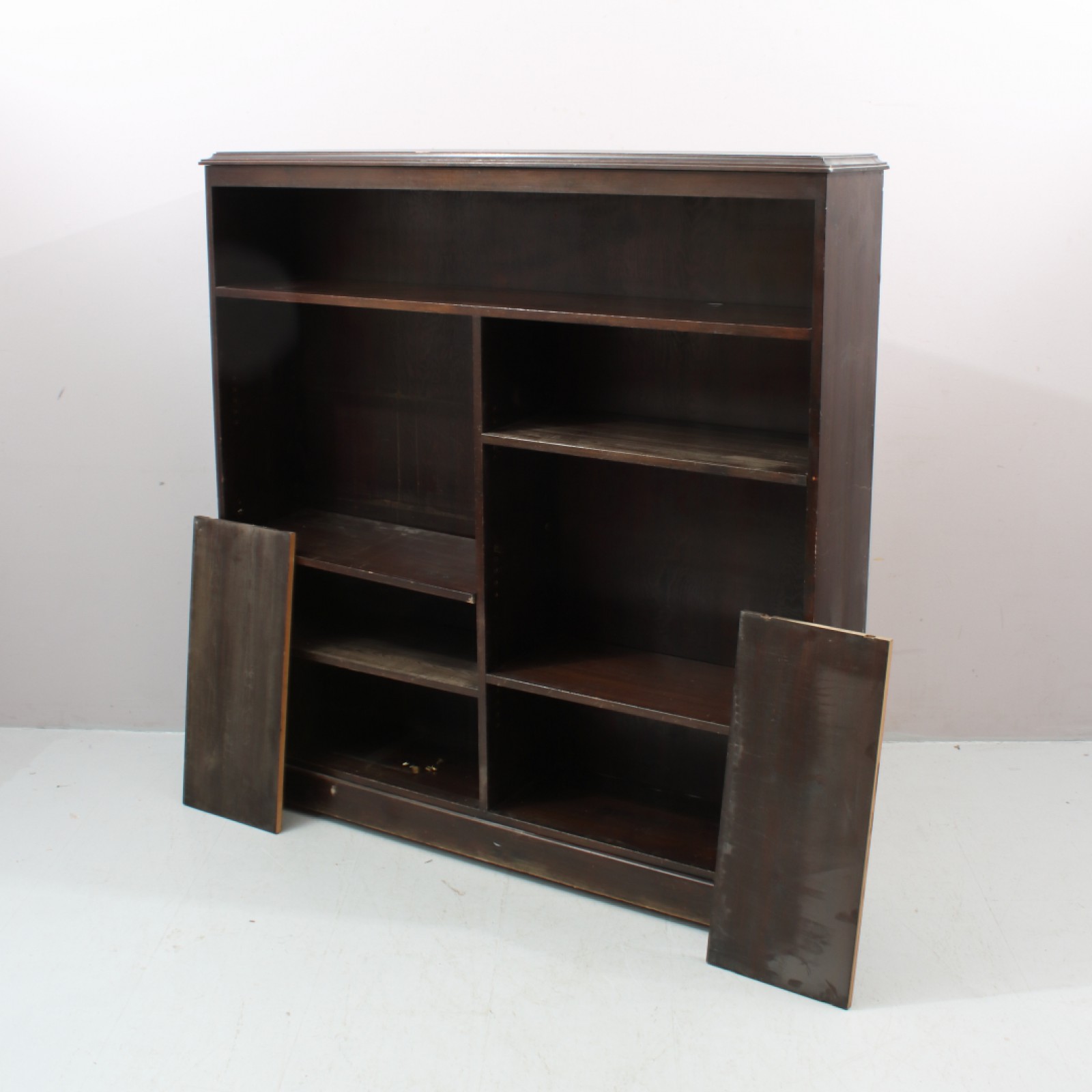 BOKHYLLA 1900-talets mitt, skav märken förekommer.H:149cm B:144cm Dj:32cm. bakfot med avslag (se bilder), något ranglig.(Vån1) Avslutas 2026-03-22 18:00:00